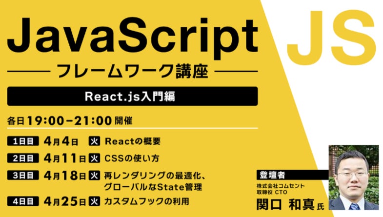 【Webクリエイター向け】“React.js”の基本をみっちり学ぶ!4/4(火)~ 「JavaScriptフレームワーク講座」(全4回・無料)をオンライン開催
