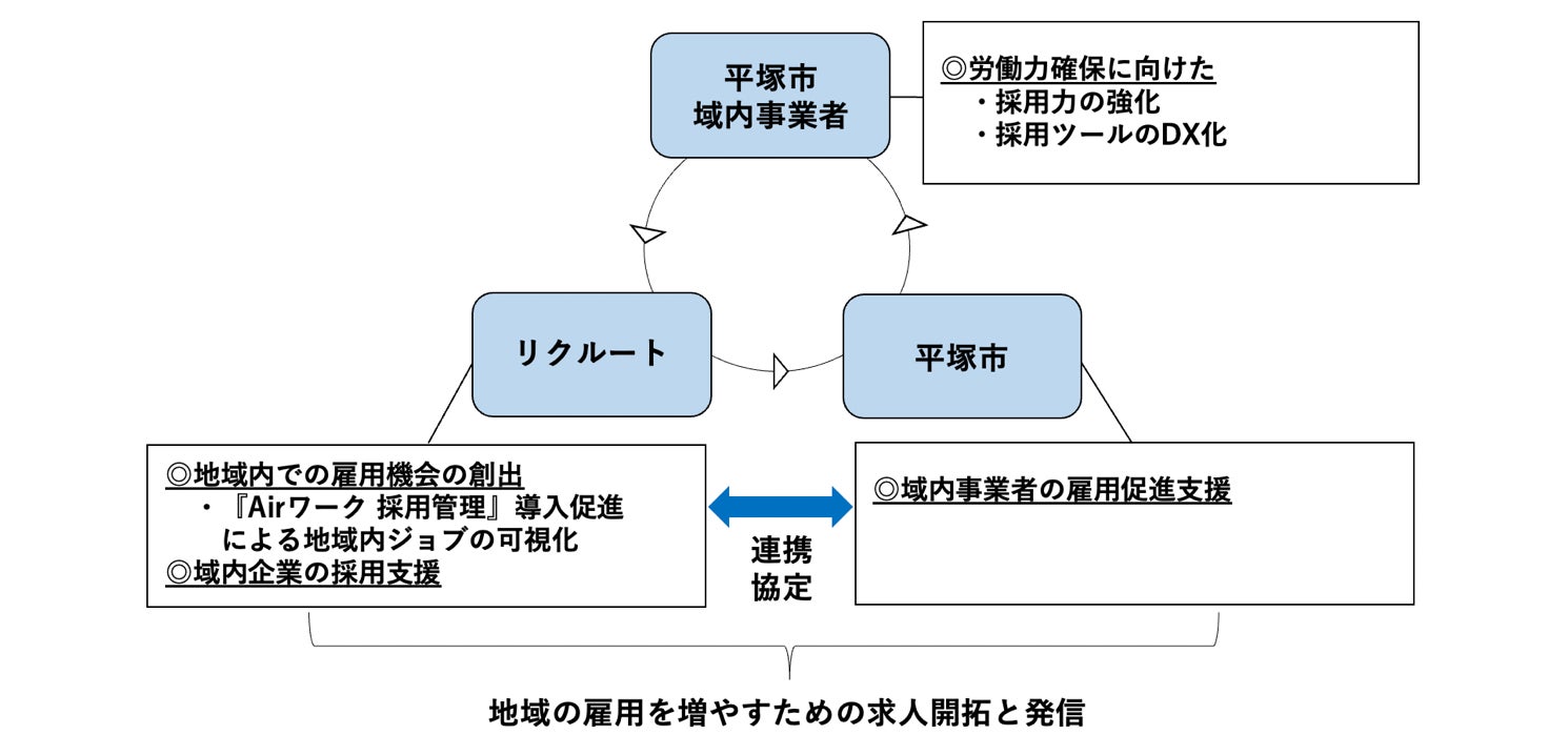 株式会社リクルート(本社:東京都千代田区、代表取締役社長:北村 吉弘、以下当社)は、2024年12月11日、神奈川県平塚市との間で雇用促進に関する協定を締結し、連携を開始することとなりましたので、お知らせ致します。『Airワーク 採用管理』で、地元企業の採用ホームページ開設を支援します。