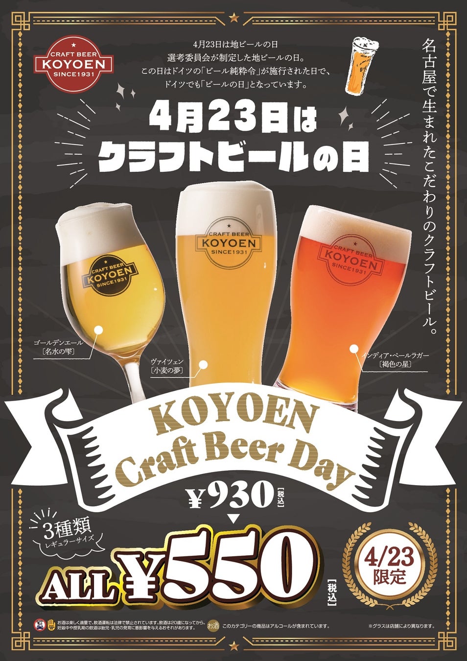 この日を記念して、“浩養園クラフトビールの発信基地”として名古屋市で展開する「CRAFT BEER KOYOEN」2店舗と浩養園クラフトビールの醸造所がある「浩養園BREWERY アトリウムホール」の計3店舗で、3種類の浩養園クラフトビール(グラスサイズ)を、4月23日(水)当日限定で通常価格930円(税込)~のところ特別価格550円(税込)で提供します。