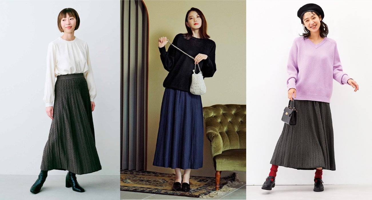 あたたかみのあるケーブル柄のニットスカートです。すそに向かってきれいに広がるAラインシルエットなので、体型にかかわらずおしゃれに着用できます。さらに縦ラインと柄行きが広がるよう編み立てることで、華やぎと着やせの視覚効果を上乗せされています。着まわしやすいダークカラーの3色展開です。
