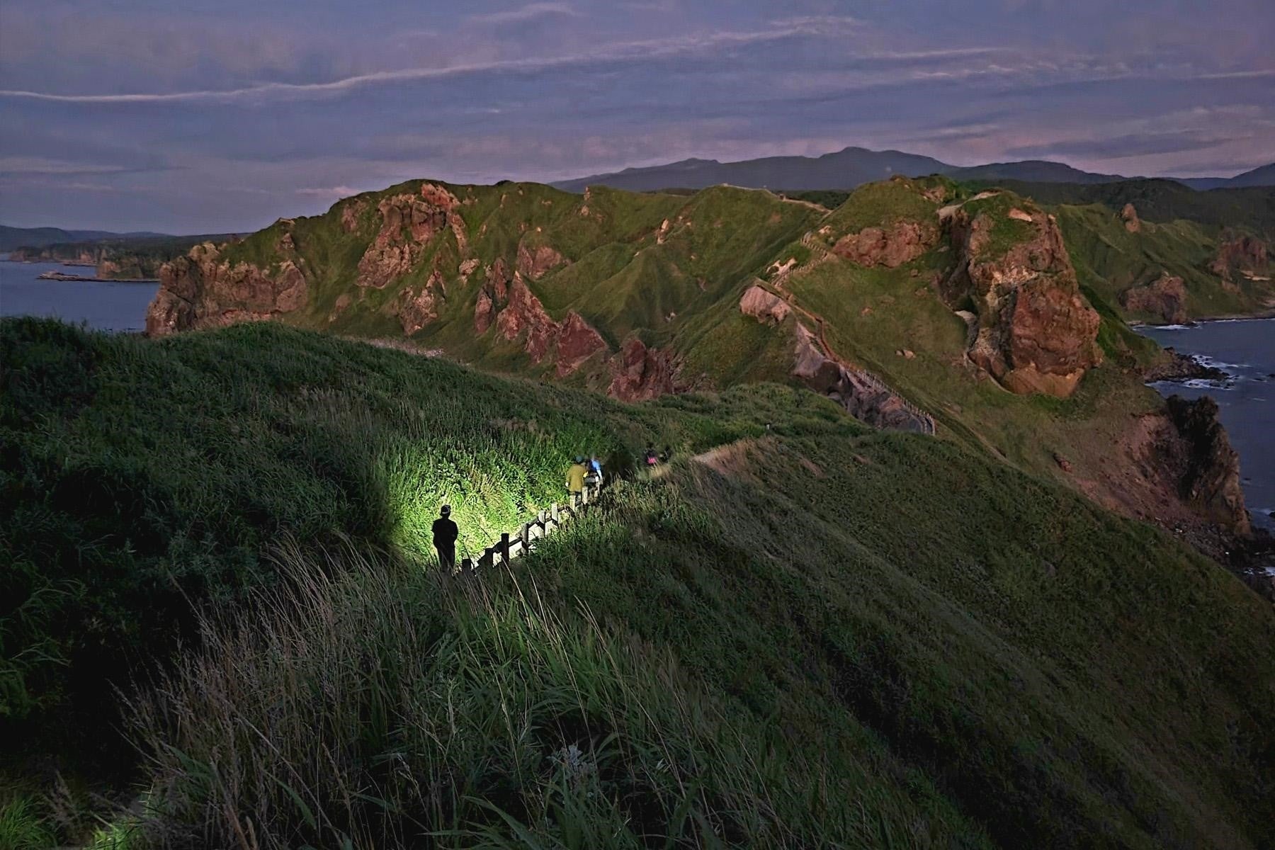 今回のツアーでは、神威岬駐車場から神威岬灯台がある岬の突端まで約1.2kmの道のりを、ガイドの解説を聞きながらゆっくり1時間かけて散策。ツアーの途中で日没を迎えるため、普段は見られない神威岬灯台が点灯する瞬間や、夕暮れから満天の星空へ刻々と変化していく岬の景色を堪能することができます。夕日をイメージしたハーブティーや、星空観察のための天体望遠鏡も用意します。さらに、灯台守と家族が暮らした住居の跡地や、高い使命感で職務にあたった灯台守たちの物語をガイドが紹介。灯台の光が照らす海を眺めながら、人と海とのつながりについて思いを馳せることができます。