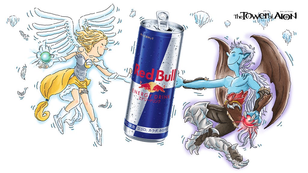今回のコラボを記念し、「タワー オブ アイオン」の天族と魔族が「レッドブル・エナジードリンク」を持つ限定カートゥーンイラストを公開しました。