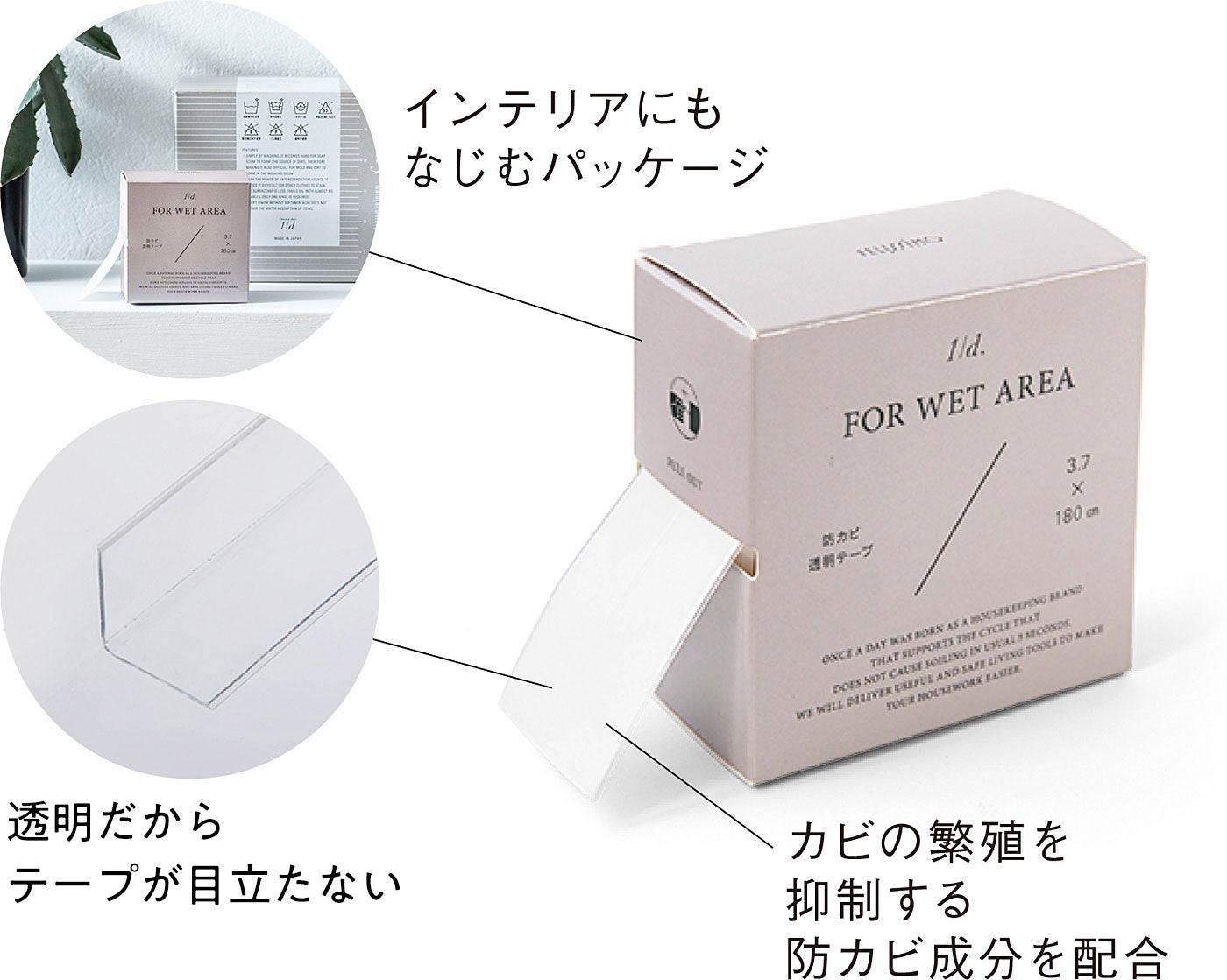 カビが発生しやすい水まわりの目地やすき間をカバーする透明テープです。透明だからインテリアの邪魔にならず、カビの発生を抑制する防カビ成分を配合しています。ホコリがたまりやすい浴室の出入り口や、手が届きにくいお風呂の壁と天井のすき間などに貼って、カビを予防できます。テープの中央に折り線が入っているから、コーナーにも使用できます。