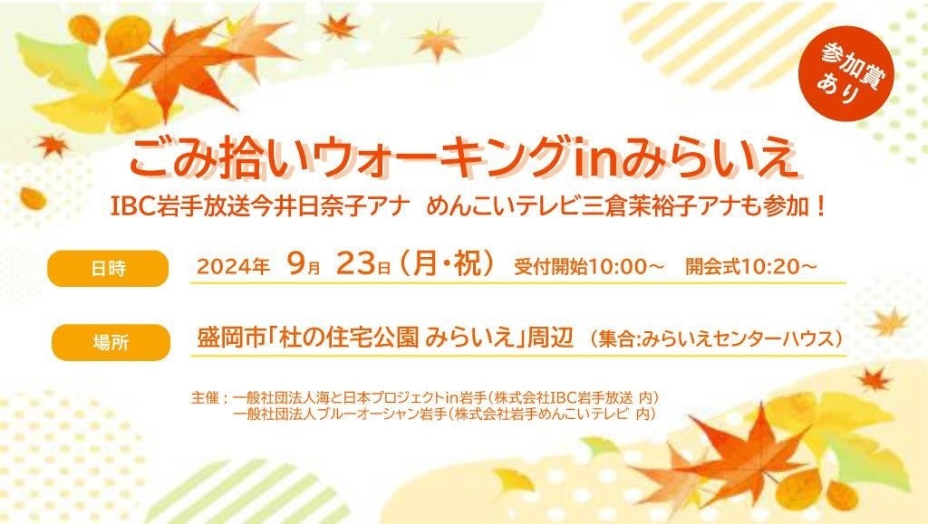 岩手のキレイで豊かな海を守り、未来へつなぐため、また岩手の皆さんの健康増進のために「ごみ拾いウォーキングinみらいえ」を岩手県盛岡市「杜の住宅公園 みらいえ」周辺にて開催いたします。