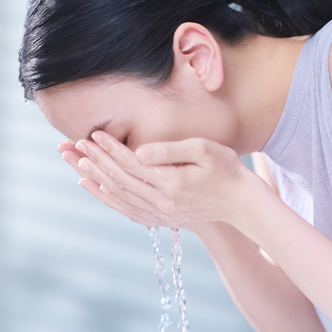 ●水またはぬるま湯で、肌を軽くなでるように流します。(洗いながら美容液が軽くなったら、洗い流し終了のサインです。
