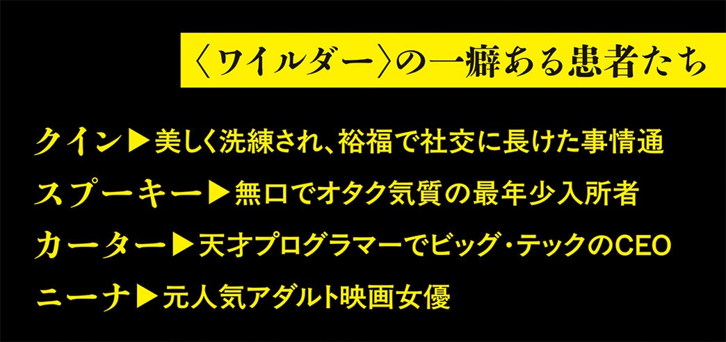 LA郊外、超高級精神医療施設ワイルダーに入所したホープ・ナカノは、最先端技術による記憶治療を受けている。医師たちが説く覚えのない過去、姿を消す入所者、増える投薬。これらは治療なのか、人格改造なのか? ここから出られる日は来るのか? 施設がひた隠しにする闇を追うホープに、医師は更に強力な施術を迫る。エドガー賞最優秀新人賞最終候補となった戦慄のサイコ・サスペンス!