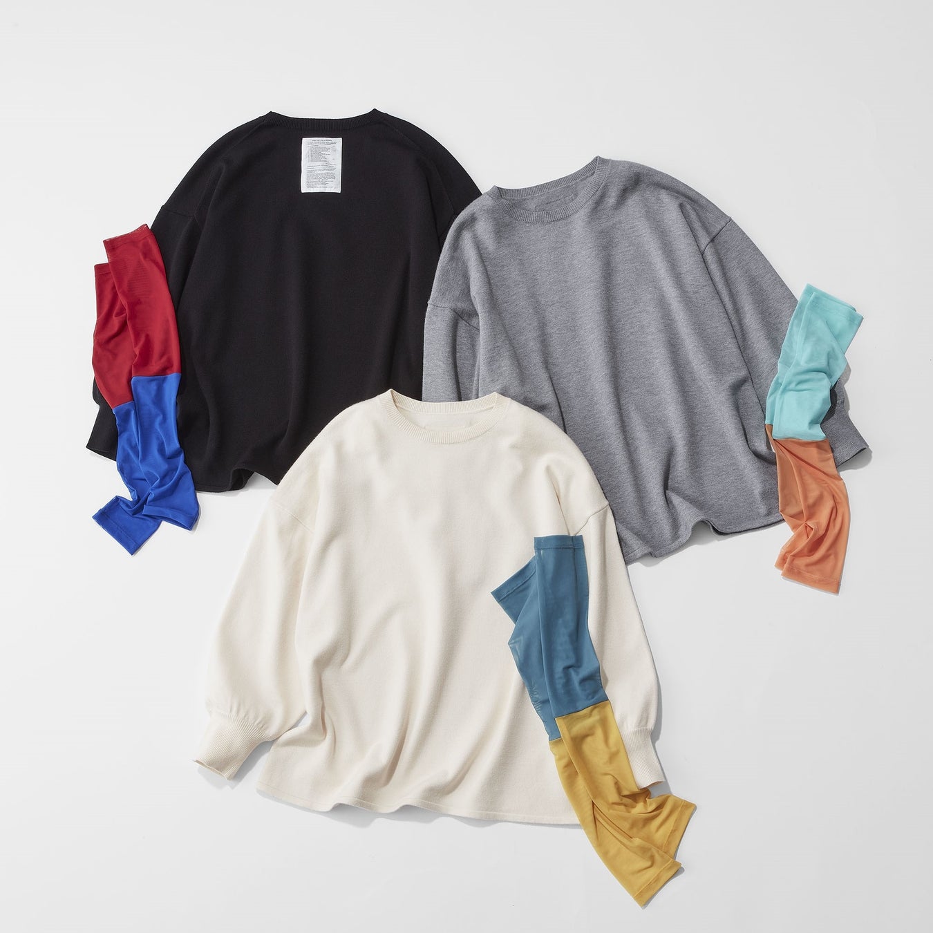 ニットが苦手な310が作った【ニットっぽくないニット】ニットの暖かさや軟らかさはそのままに、カットソー見えする質感と着膨れしにくい厚さ、楽ちんに着れるシルエットにこだわりました!また付属パーツで簡単にトレンドの袖レイヤードスタイルを楽しむこともできます。