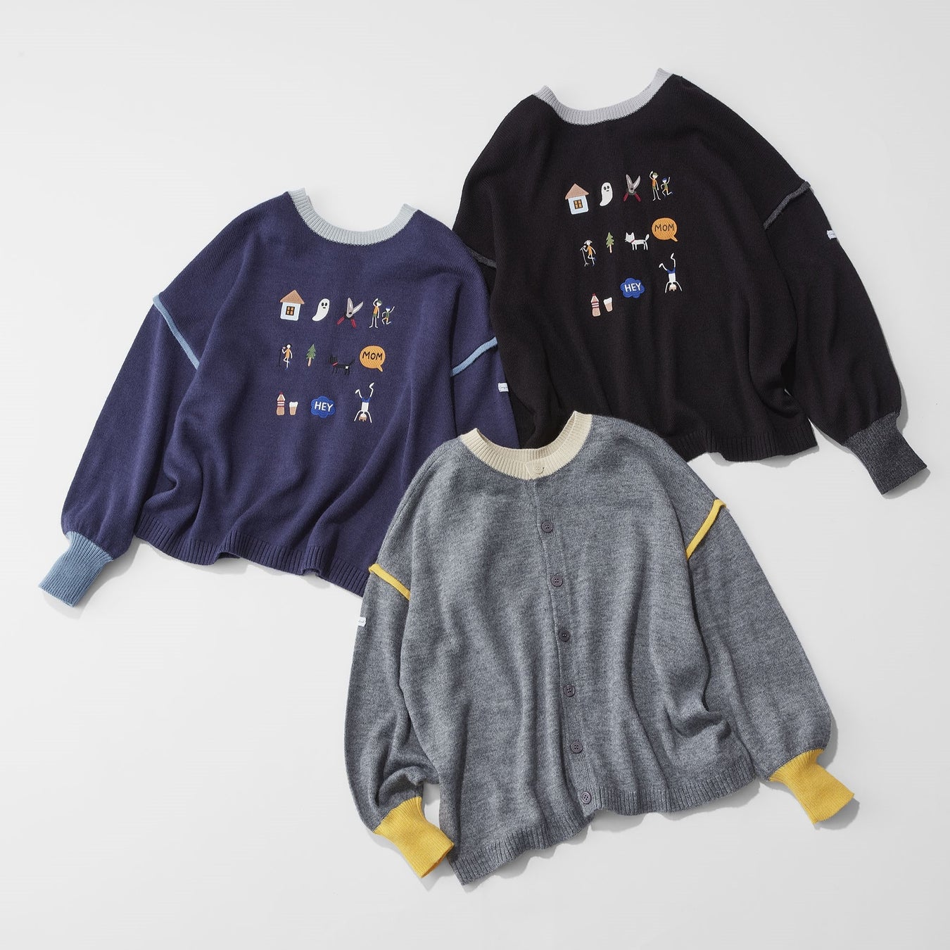 遊び心たっぷりのらくがきを刺繍にした個性派ニット。ゆったり着用できるサイズ感と着膨れしてみえない柔らかな生地にこだわりました!前後どちらを前にしても着用できるのでプルオーバーとしてもカーディガンとしても使えます。