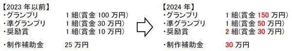 今年は賞金と入選者に提供する制作補助金を増額するとともに、受賞作品数を増やし、より自由な発想による作品プランのチャレンジと実現を支援します。※公募に関する概要は、次をご覧ください。