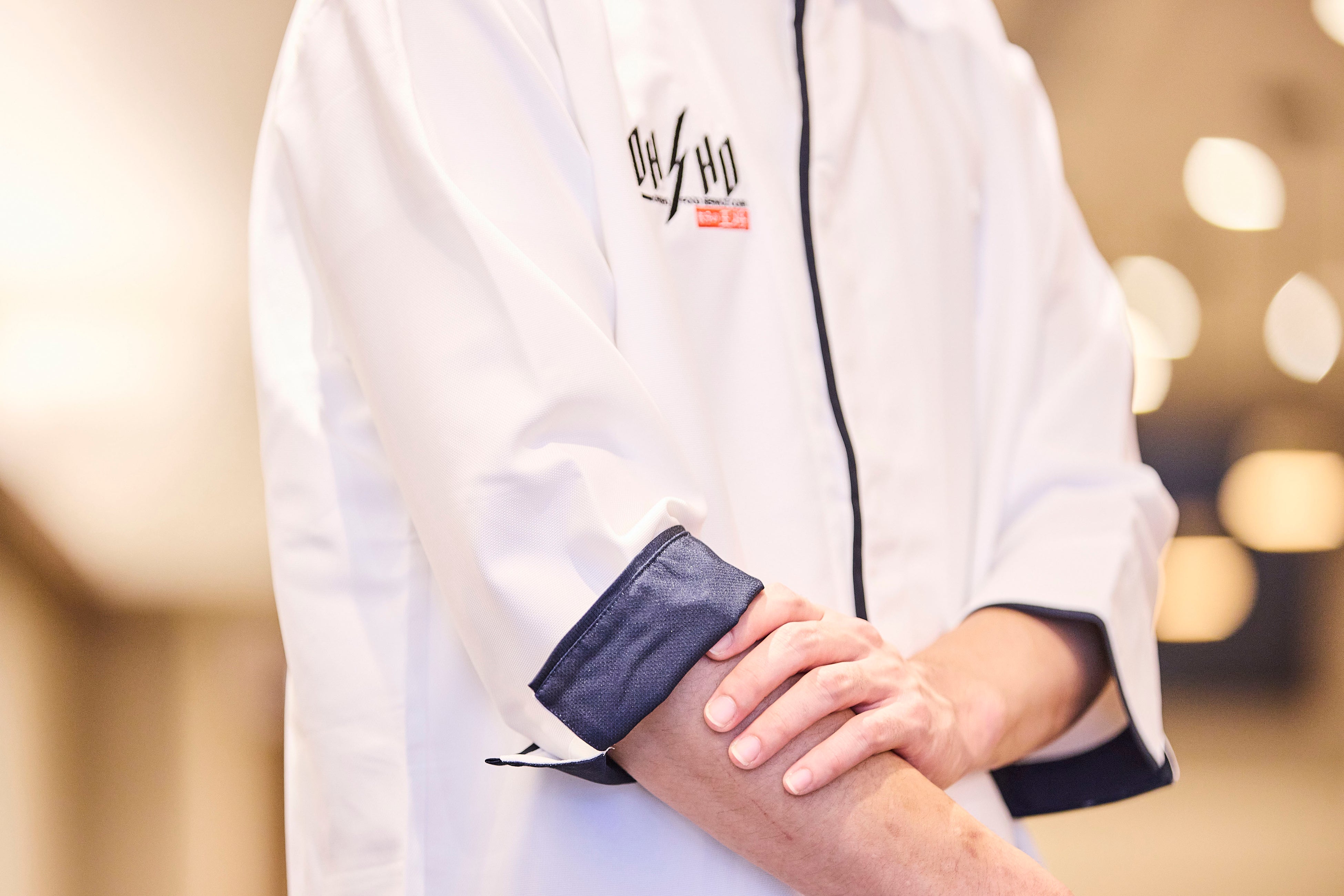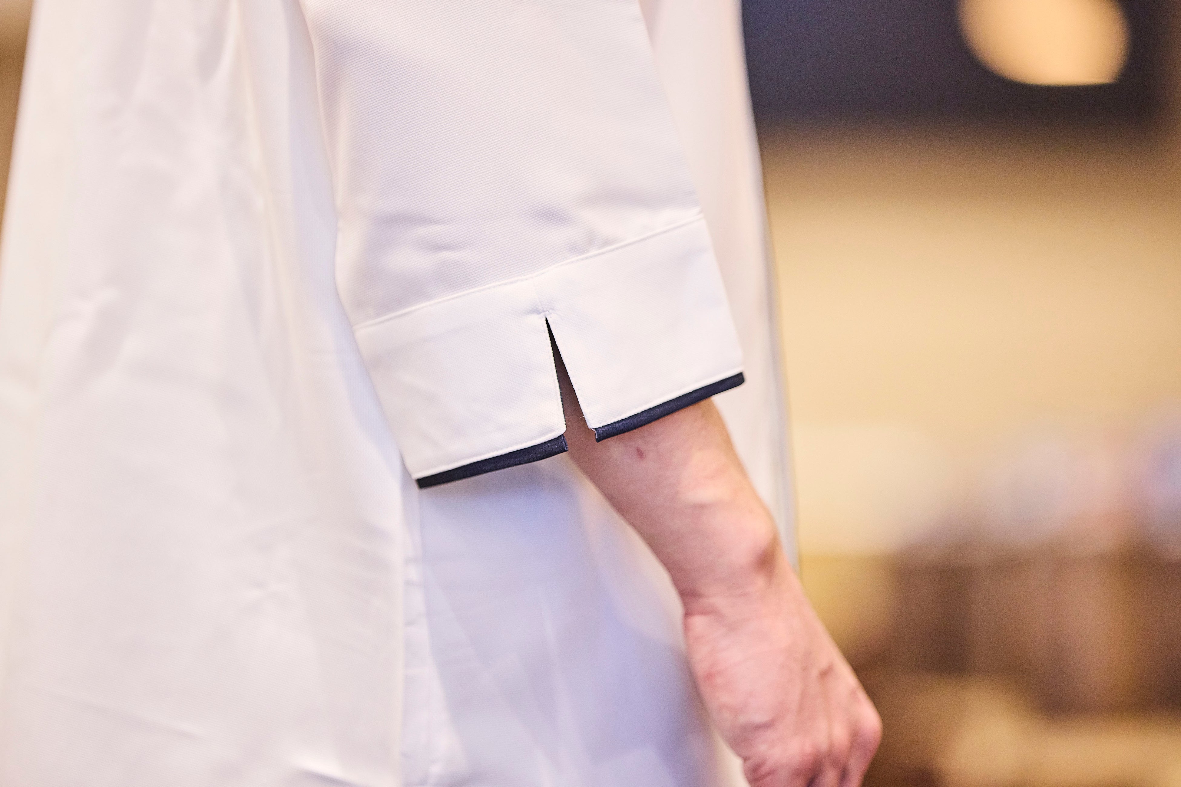 襟裏や袖裏といった汚れやすい部分には配色生地を用い、見た目のアクセントになるだけでなく、お客さまから見ても「清潔感」を感じていただけるように配慮しています。素材には柔らかさとほどよいハリ感を兼ね備えたオックスフォード生地を採用。着用時のシルエットを美しく保ちます。さらにスナップボタンを使用することで、異物混入を防止し、安全性にも配慮しました。細部へのこだわりがプロの現場での安心と信頼感を実現します。
