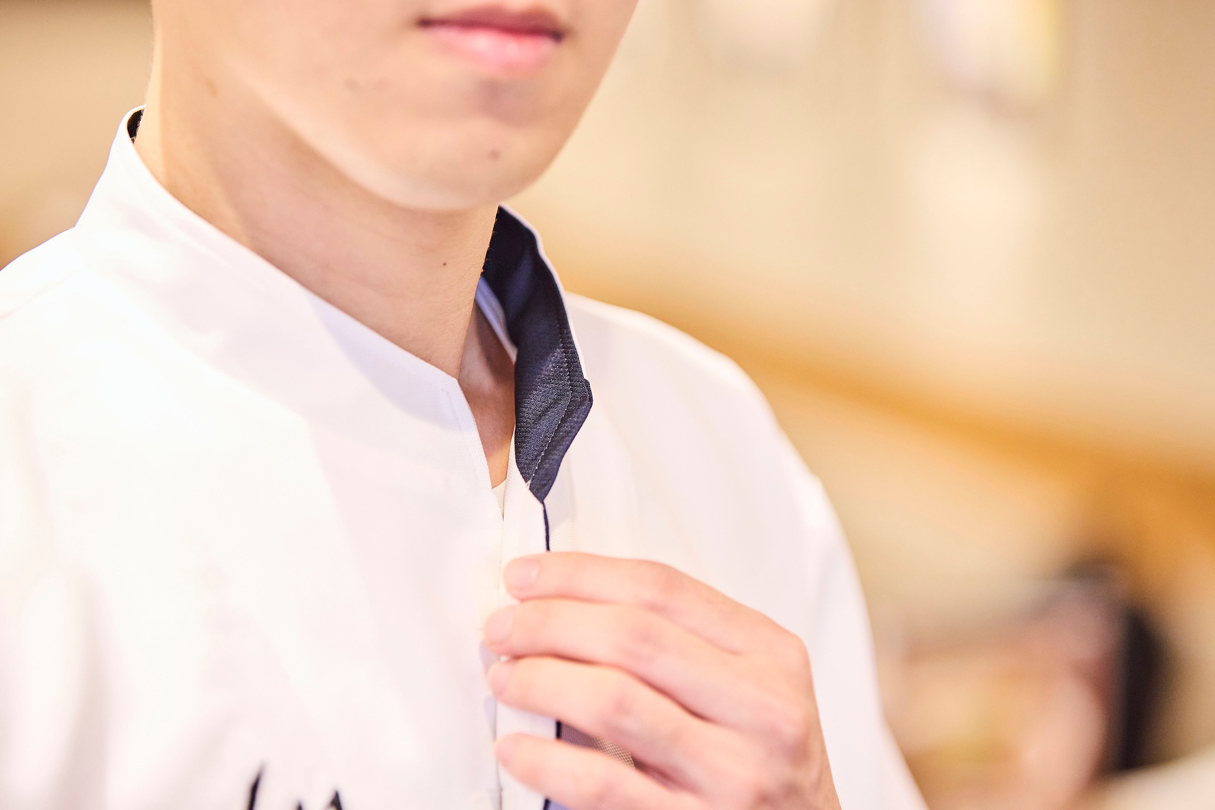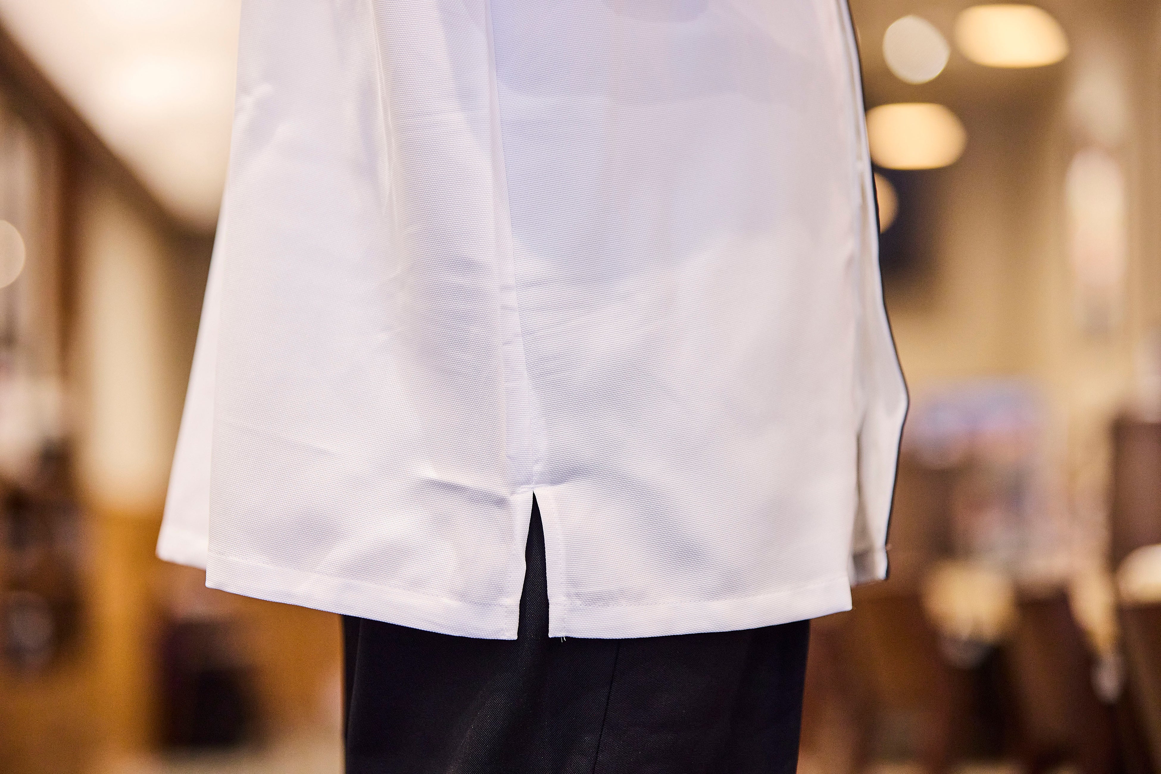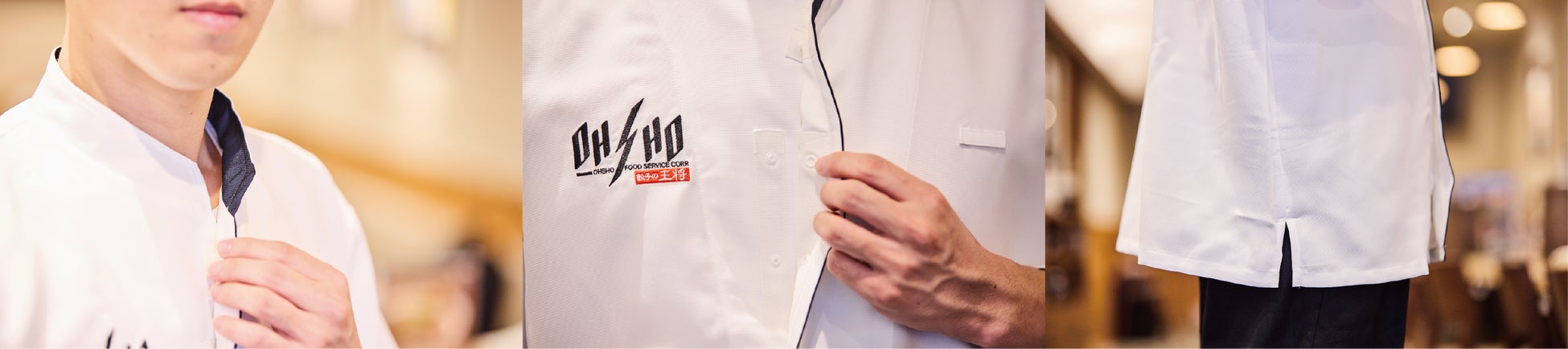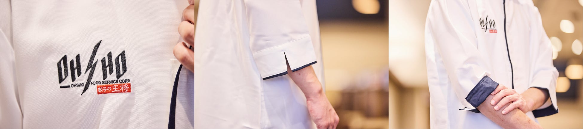 伝統と技を受け継ぐ料理人の誇りを体現したユニフォームです。立ち襟のデザインは、スマートで凛とした姿勢を象徴します。胸元から裾にかけての一直線のパイピングが白衣の清潔さと美しさを際立たせるとともに、料理への情熱と誇りを視覚的に伝え、「餃子の王将」で働くプロの料理人たちの技術と信頼をお客さまに感じていただけるデザインに仕上げました。
