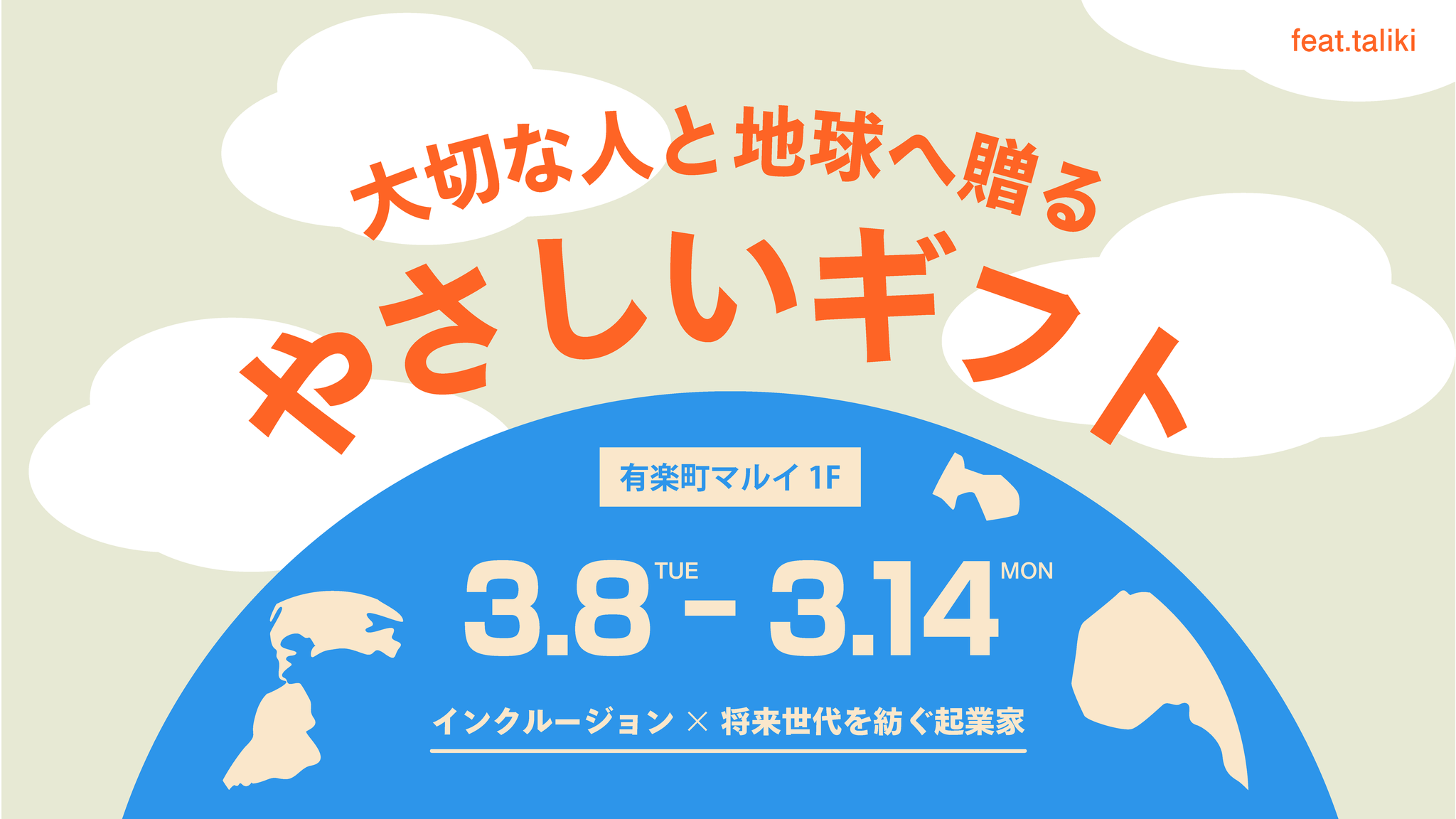 有楽町マルイ(株式会社丸井、本社:東京都中野区、代表取締役社長:青野 真博)で開催する「インクルージョンフェス2022春」の一環として、将来世代の社会起業家育成プログラムやオウンドメディアを活用し、社会課題起業家を支援する企業「株式会社taliki」(本社:京都府京都市、代表取締役:中村 多伽、以下:taliki)プロデュースのもと、さまざまな社会課題解決に取り組む将来世代起業家6人が『インクルージョン×将来世代を紡ぐ起業家feat.taliki』を開催いたします。