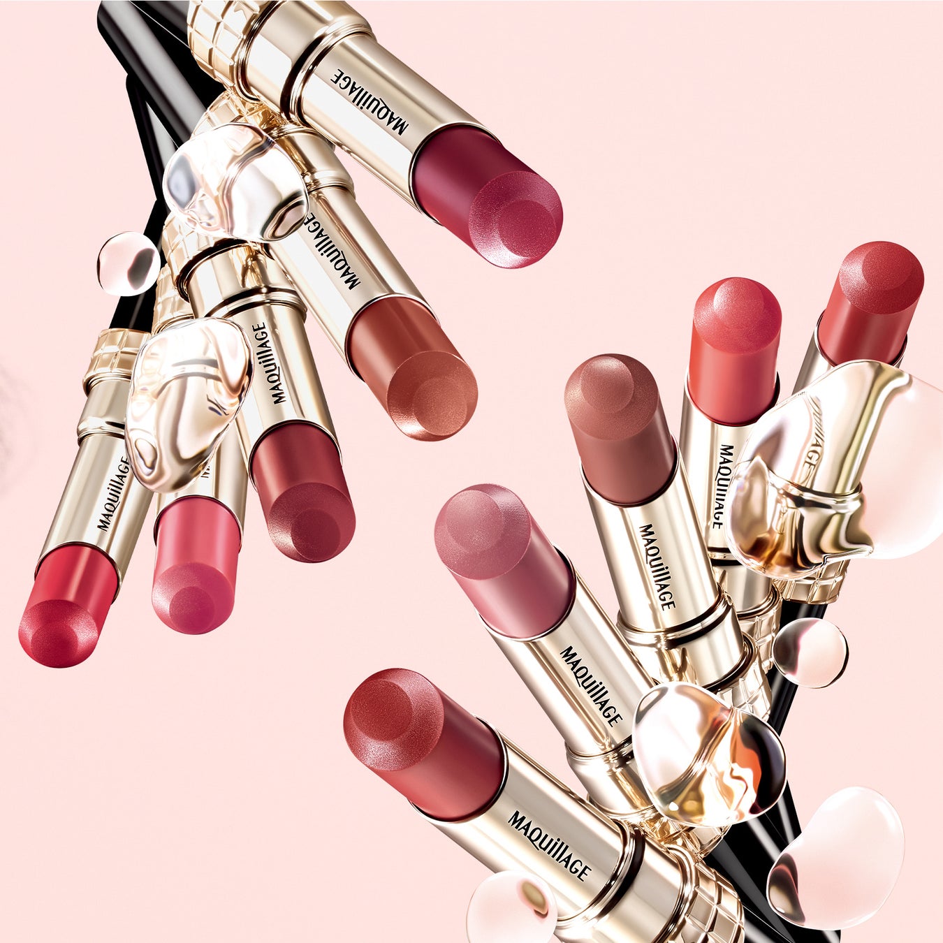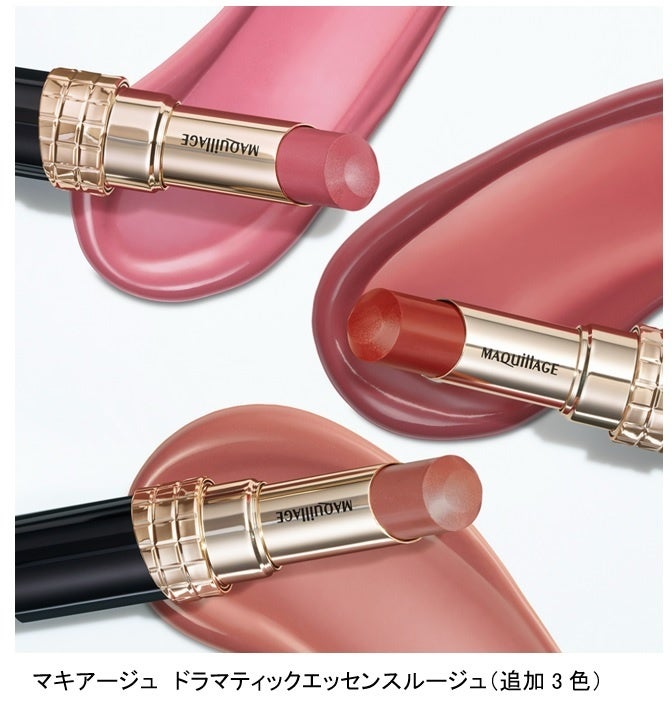 「ドラマティックエッセンスルージュ」は、発売以来累計出荷個数119万個※3を突破し、うるおいや荒れにくさ、色もちについて多くのお客さまにご好評いただいているマキアージュを代表する口紅です。厳選された濃密美容オイルを配合し、唇にうるおいを与え、つけるたび”うるつや唇”へ導きます。資生堂独自の技術により、濃密美容オイルを包み込んだカラー成分が唇上で密着し美膜を形成することで、やわらかく軽い感触で、長時間色・つや・なめらかさが続きます※2。