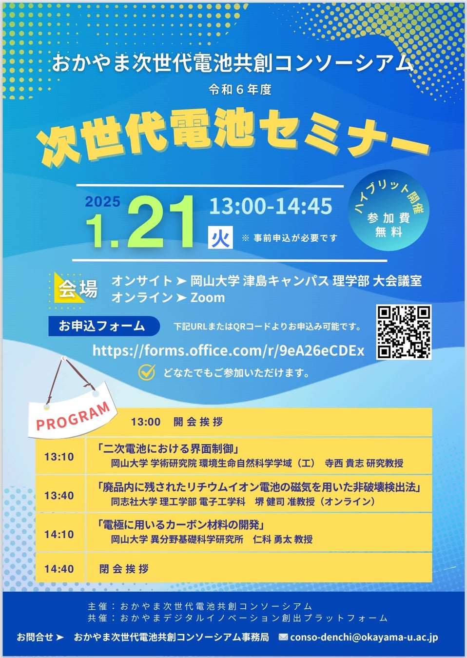 【岡山大学】おかやま次世代電池共創コンソーシアム「令和6年度 次世代電池セミナー」〔1/21,火 ハイブリッド開催〕