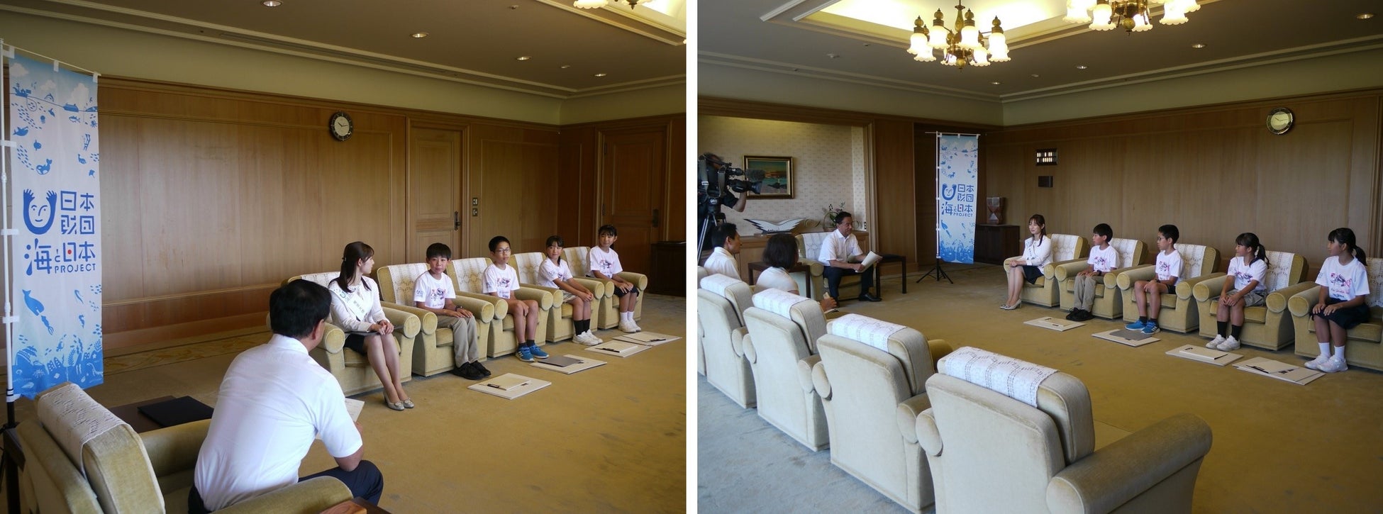 8月26日(月)、日本財団が推進する「海と日本プロジェクトinやまぐち」推進大使の畑中里咲アナウンサーと共に山口県庁を訪れたのは、7月と8月に県内の小学5・6年生が萩市と長門市で学んだ「アマダイを調べ隊」の代表児童4名です。村岡知事を前に少し緊張しながらも、しっかりと一人ひとりが自己紹介をしたのち、2日間の活動内容を写真パネルと共に説明しました。そして、これからも、「調べ隊で学んだ海の豊かさについて、多くの人に発信し、多くの人に海を守る気持ちを高めてもらえるように取り組みを考えていきたい」という決意を聞いた村岡知事は、「実際に現地に行って話を聞いたり、体験したりいろいろなことを学んだと思います。山口県は三方が海で水産資源も多い。これからもアマダイを盛り上げていきたいと思います」と感想を述べられました。