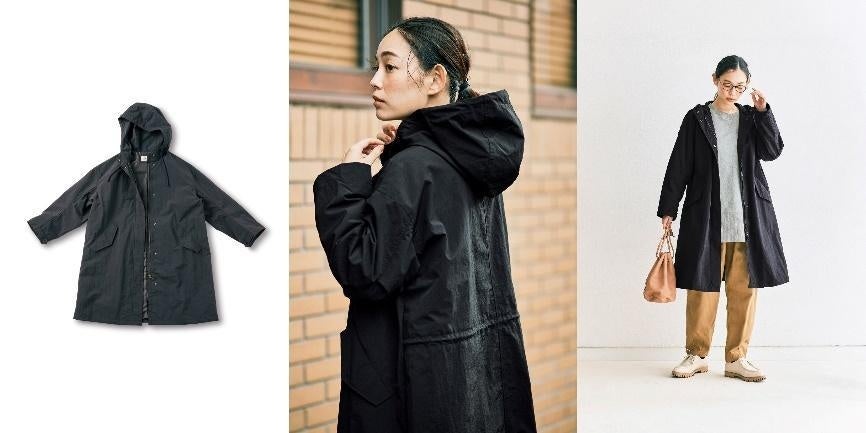 裏にコーティング加工をほどこしたナイロン素材のフードコートです。コーティングによりほどよい張り感を出し、立体的なシルエットが楽しめます。ウエスト部分には内側にひもを通しているので、少し絞ってシルエットに変化を付けられます。