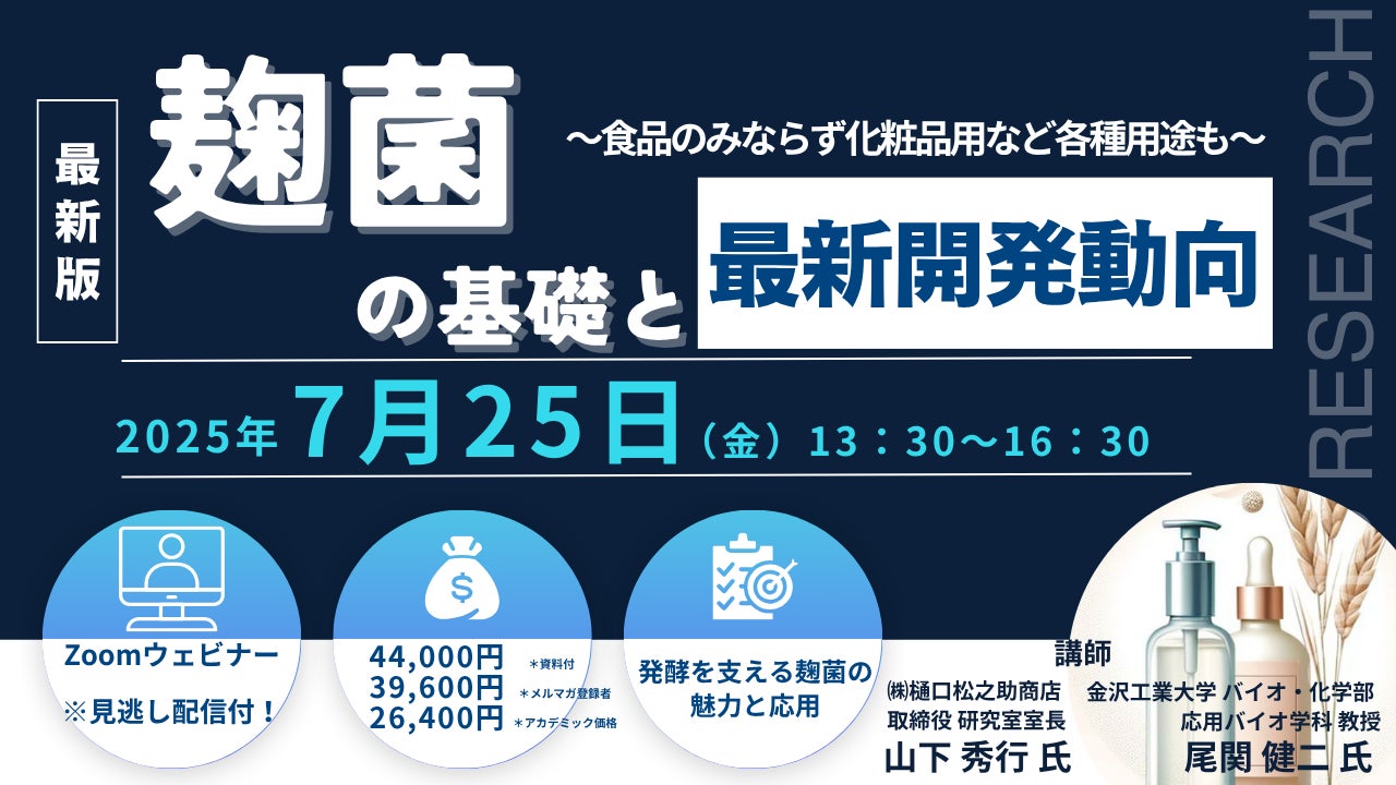 先端技術情報や市場情報を提供している(株)シーエムシー・リサーチ(千代田区神田錦町: https://cmcre.com/ )では、 各種材料・化学品などの市場動向・技術動向のセミナーや書籍発行を行っておりますが、 このたび「麹菌の基礎と最新開発動向 ~食品のみならず化粧品用など各種用途も~」と題するセミナーを、 第一部講師に山下 秀行 氏((株)樋口松之助商店 取締役 研究室室長 )第二部講師に尾関 健二 氏(金沢工業大学 バイオ・化学部 応用バイオ学科 教授)をお迎えし、2025年7月25日(金)13:30より、 ZOOMを利用したライブ配信(見逃し配信付き)で開催いたします。 受講料は、 一般:44,000円(税込)、 弊社メルマガ会員:39,600円(税込)、 アカデミック価格は26,400円(税込)となっております(資料付)。