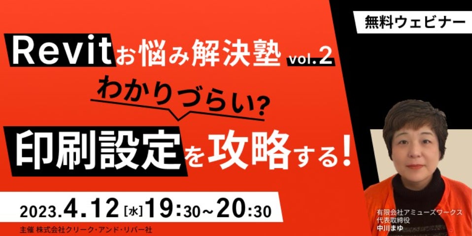 株式会社クリーク・アンド・リバー社(C&R社)は4月12日(水)、BIMエンジニアとしてご活躍されている方やBIMを習得したいとお考えのCADオペレーターの方などを対象に、無料のオンラインセミナー「Revitお悩み解決塾vol.2 わかりづらい印刷設定を攻略する!」を開催いたします。