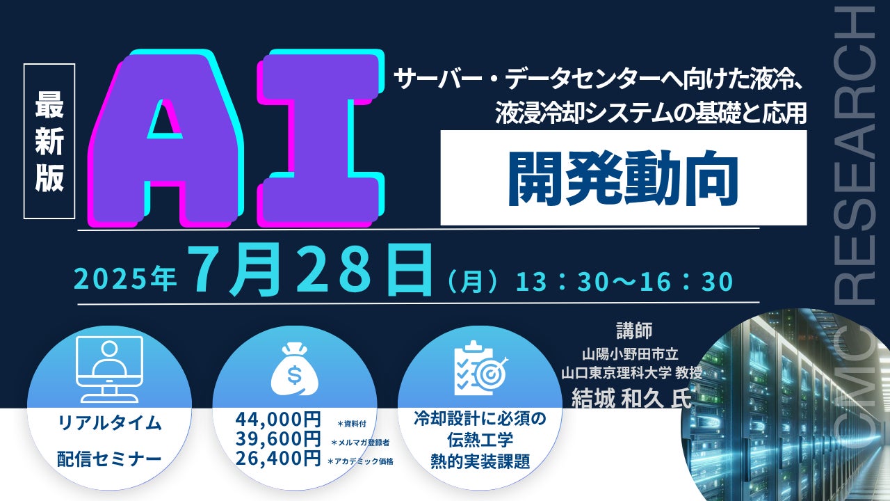 先端技術情報や市場情報を提供している(株)シーエムシー・リサーチ(千代田区神田錦町: https://cmcre.com/ )では、 各種材料・化学品などの市場動向・技術動向のセミナーや書籍発行を行っておりますが、 このたび「AIサーバー・データセンターへ向けた液冷、液浸冷却システムの基礎と応用、開発動向」と題するセミナーを、 講師に結城 和久 氏(山陽小野田市立 山口東京理科大学 教授)をお迎えし、2025年7月28日(月)13:30より、 ZOOMを利用したライブ配信で開催いたします。 受講料は、 一般:44,000円(税込)、 弊社メルマガ会員:39,600円(税込)、 アカデミック価格は26,400円(税込)となっております(資料付)。