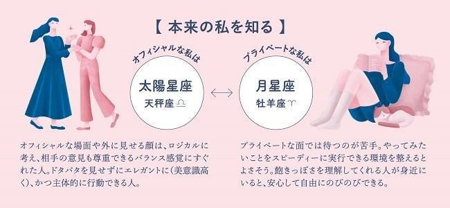 生まれた日・時間・場所の3つの情報から「ホロスコープ(生まれた瞬間の惑星の配置図)」を作成して占います。まずは一般的な12星座占いの星座である「太陽星座」と、あまり注目されることが少ない「月星座」のチェックから始めます。「太陽星座」はオフィシャルな場で見せる自分を、「月星座」はプライベートな場で見せる自分を表します。もうひとつの自分の性質である月星座を知ることで、自分自身がもっといとおしく感じられ、心の波の上下にも客観的に向き合うことができます。