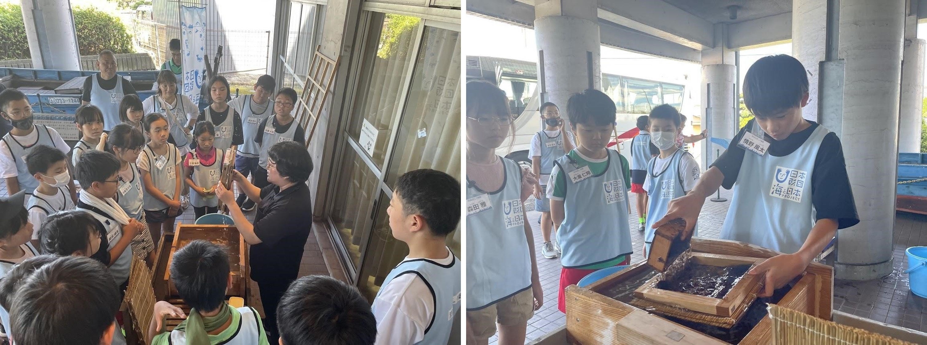 「海苔つけ」はかつて行われていた方法で、水に浮かんでいる生海苔を板海苔に加工する作業です。均等な厚みに仕上げるのが難しいので、子どもたちは先生のレクチャーを受けながら、初めての体験に苦戦しつつも、出来上がった板海苔に満足した表情を見せていました。美味しい海苔を作るためには手間と時間が掛かることを知った子どもたちからは、地元の伝統的な海産物である海苔について、「これからは感謝しながらいただくようにする」「買ったら最後まで食べきるようにしたい」という感想が出ました。