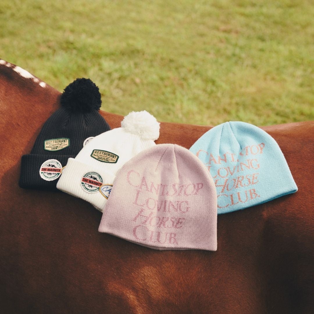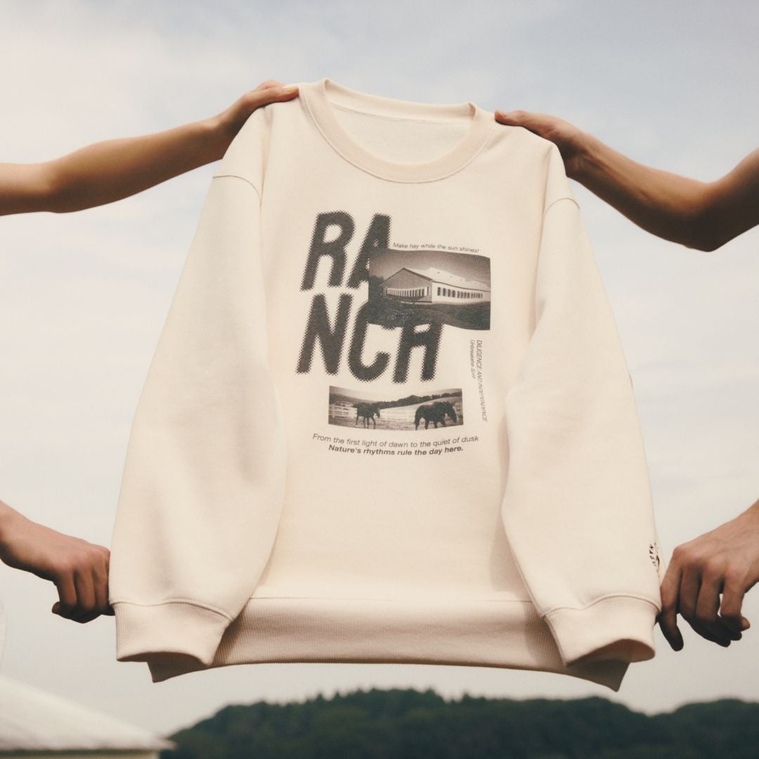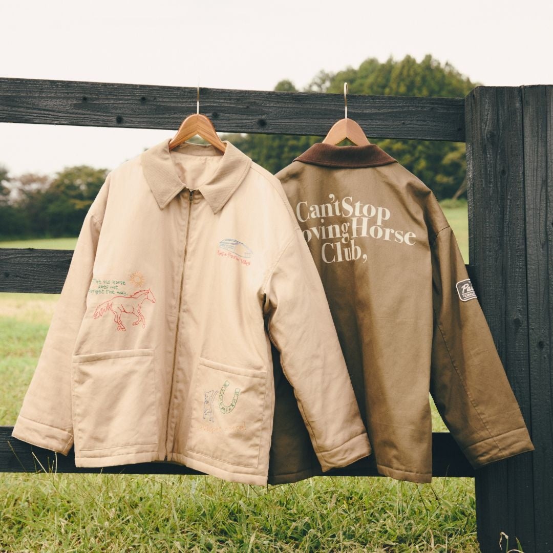 本コラボレーションでは、ウィメンズアパレルと服飾雑貨をラインアップしており、実際に「NASU FARM VILLAGE」で撮影された写真を使用したフォトスウェットや<Can’t Stop Horse Club,>という人気のロゴをあしらった中綿入りジャケット、象徴的なトラクターや動物をジャガード編みで表現したニットプルオーバーと、アパレルアイテムに連動したデザインのニット帽など「NASU FARM VILLAGE」の世界観を表現した特別なコレクションに仕上がりました。
