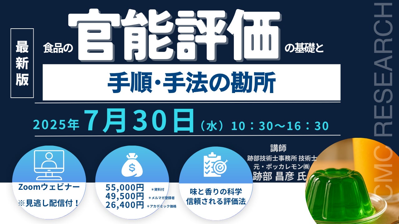 先端技術情報や市場情報を提供している(株)シーエムシー・リサーチ(千代田区神田錦町: https://cmcre.com/ )では、 各種材料・化学品などの市場動向・技術動向のセミナーや書籍発行を行っておりますが、 このたび「食品の官能評価の基礎と手順・手法の勘所」と題するセミナーを、 講師に跡部 昌彦 氏 (跡部技術士事務所技術士(農業・総合技術監理部門))をお迎えし、2025年7月30日(水)10:30より、 ZOOMを利用したライブ配信(見逃し配信付き)で開催いたします。 受講料は、 一般:55,000 円(税込)、 弊社メルマガ会員:49,500 円(税込)、 アカデミック価格は26,400円(税込)となっております(資料付)。