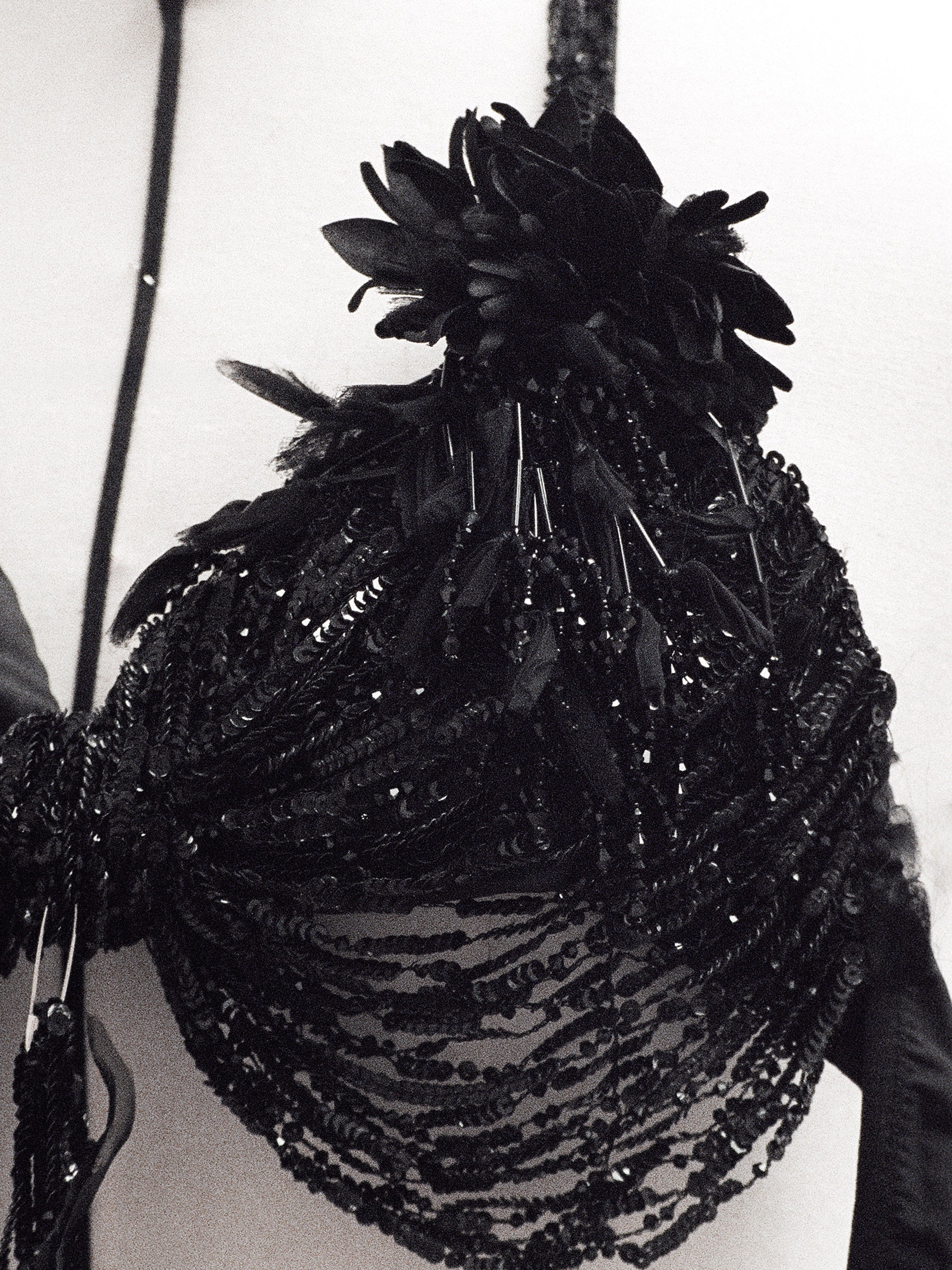 クロージングルックでは、レースとサテンのボディスーツにホワイトレースのケープを合わせたルックも披露しています。