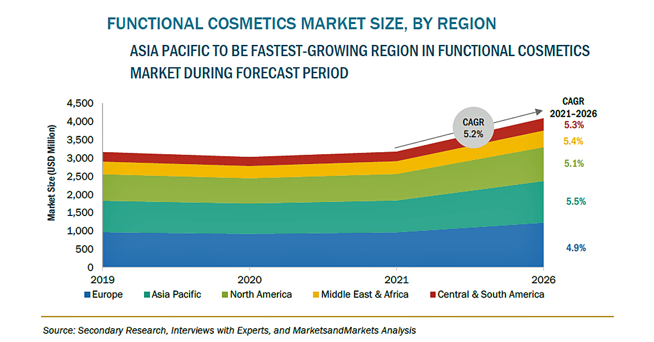 機能性化粧品の市場規模は、2021年の32億米ドルからCAGR5.2%で成長し、2026年には41億米ドルに達すると予測されています。多機能成分への需要の高まりや、アンチエイジング、美白、日焼け止めなどの需要の加速などの要因が市場の主な推進要因となっています。また、男性用化粧品へのシフトが、市場の大きな成長機会となっています。欧州は、機能性化粧品の世界的な主要市場であり、同時に、最も急速に市場が成長している地域でもあります。一方、アジア太平洋地域は、世界市場における第2位の市場であり、北米がそれに続きます。