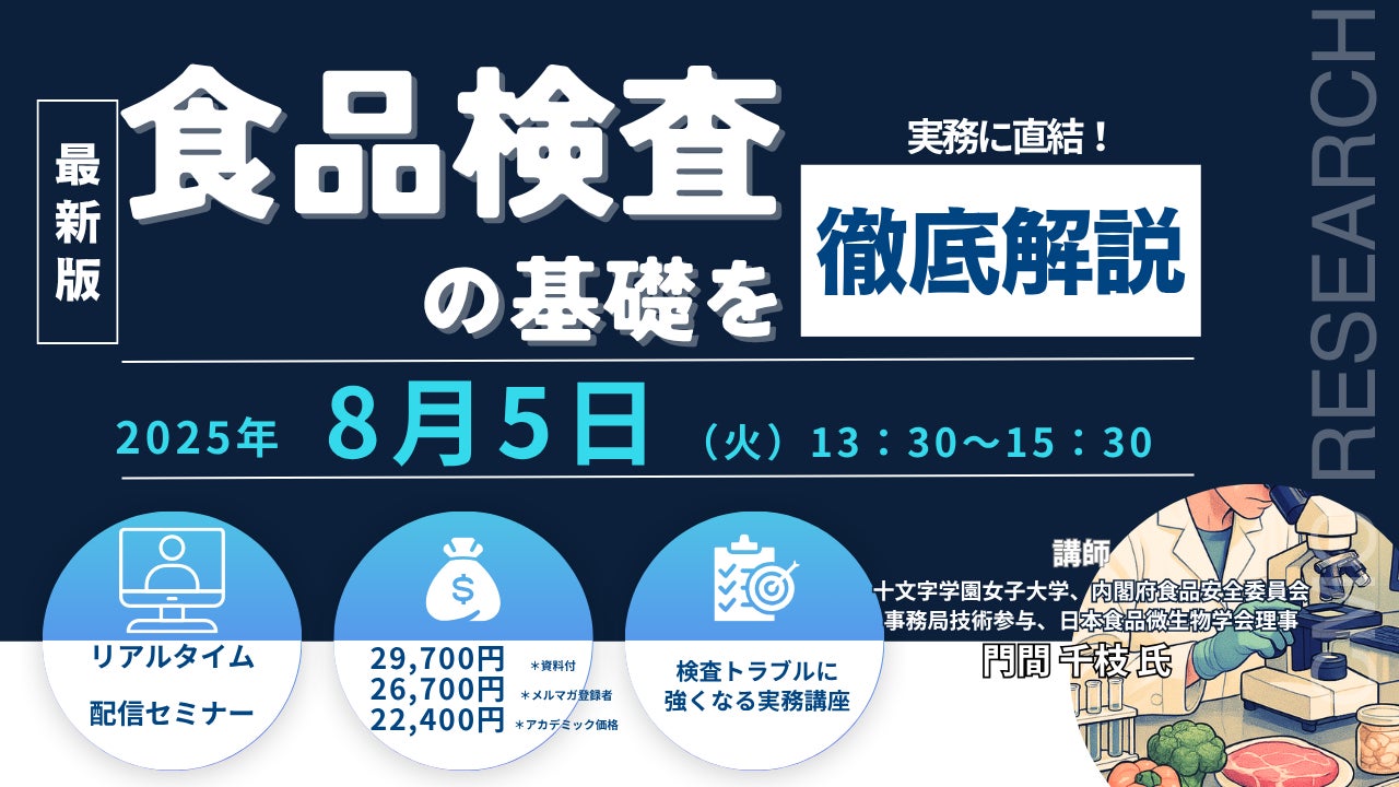 先端技術情報や市場情報を提供している(株)シーエムシー・リサーチ(千代田区神田錦町: https://cmcre.com/ )では、 各種材料・化学品などの市場動向・技術動向のセミナーや書籍発行を行っておりますが、 このたび「実務に直結! 食品検査の基礎を徹底解説」と題するセミナーを、 講師に門間 千枝 氏 (十文字学園女子大学)をお迎えし、2025年8月5日(火)13:30より、 ZOOMを利用したライブ配信で開催いたします。 受講料は、 一般:29,700円(税込)、 弊社メルマガ会員:26,700円(税込)、 アカデミック価格は22,400円(税込)となっております(資料付)。