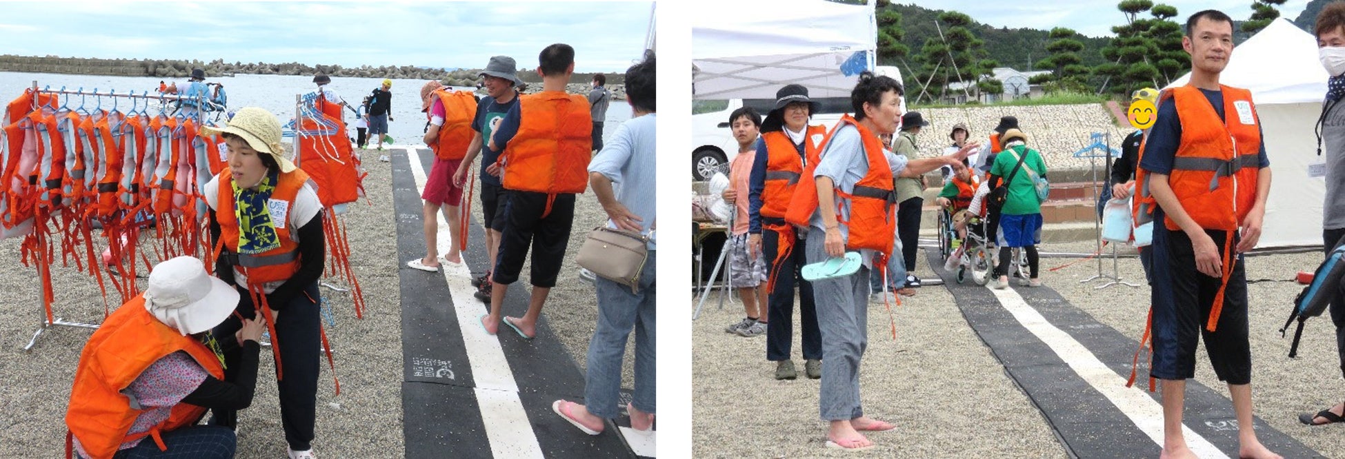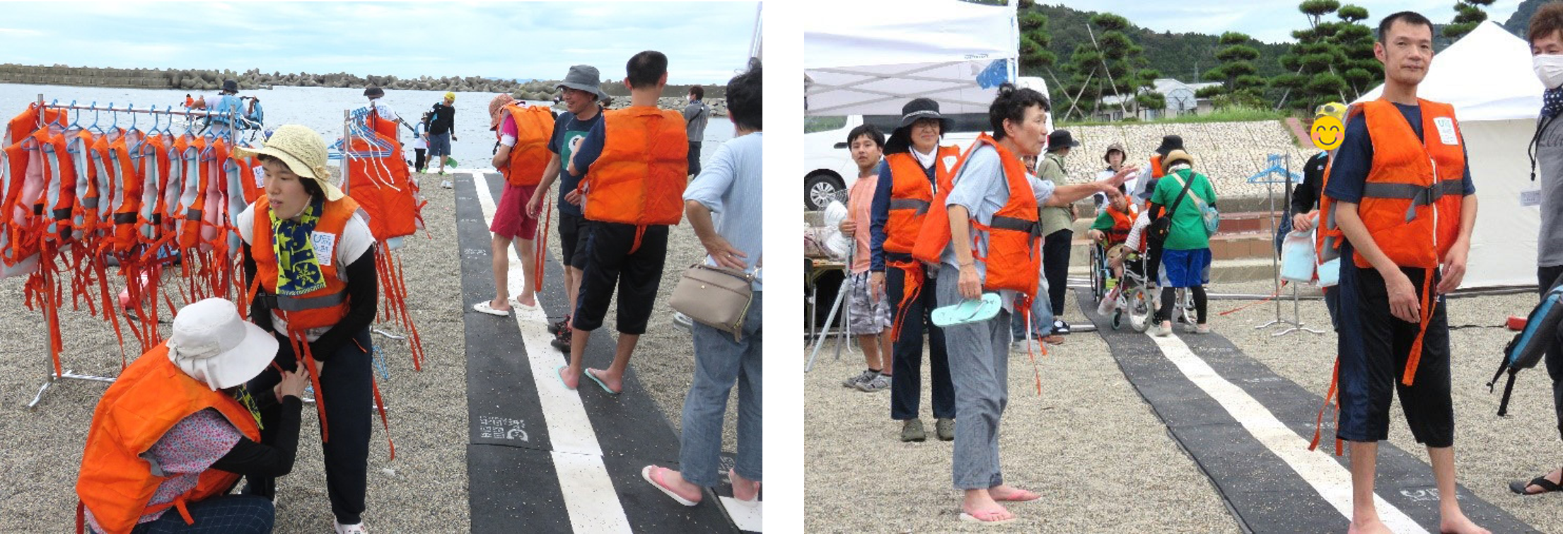 参加者たちは最初にライフジャケットの着方の指導を受け、施設職員や家族から補助してもらいながら着用します。海に入るのが楽しみで、そわそわと待ちきれない参加者の皆さん。その前に、準備運動!きちんと体操し、思い思いのアクティビティを楽しみました。