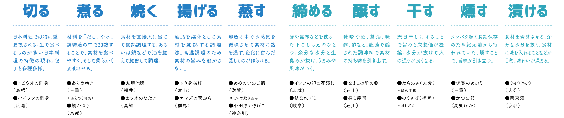 日本周辺の海洋環境の変化により、各地で獲れる魚が変わっている今、馴染みのなかった魚を美味しく食べる術はどこに?そんな疑問に、日本の海の食文化は古くから答えてきました。全国に伝わるおいしい食べ方を共有することで、日本全体で豊かな海の食文化を守っていく。そのために伝えていきたいのが、魚を美味しく食べるための「海を味わう十の技法」です。