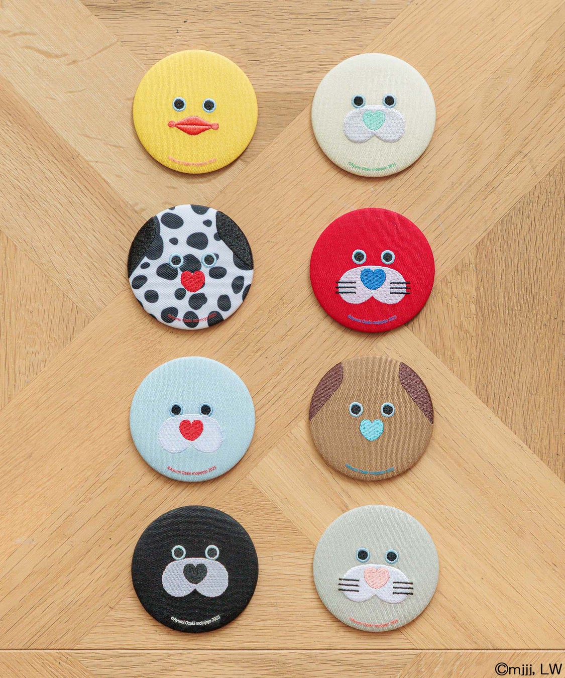 綿素材に「mojojojo」のフェイスの刺繍デザインを施したカンバッジミラー。