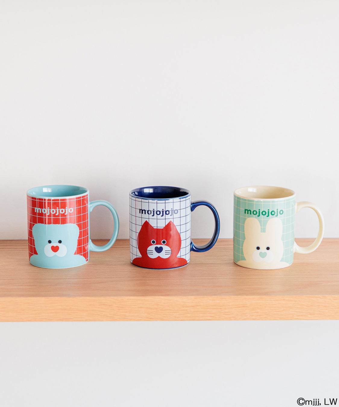 格子の総柄が“カワイイ”「mojojojo」のイラストとロゴプリントを施したシンプルなマグカップ。