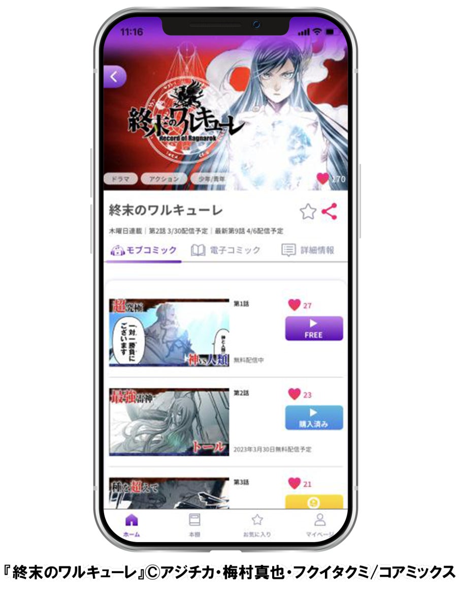 第一弾作品として、神々による人類滅亡の決議にあらがうため、ワルキューレ(戦乙女)が人類史上最強の戦士たちを選出して戦うバトル作品『終末のワルキューレ』(作画:アジチカ、原作:梅村真也、構成:フクイタクミ、出版:コアミックス)やドラマ化で話題となった患者と向き合う薬剤師の葛藤を描いた『アンサングシンデレラ 病院薬剤師 葵みどり』(作者:荒井ママレ、医療原案:富野浩充、出版:コアミックス)など、様々なジャンルの12作品を公開しております。