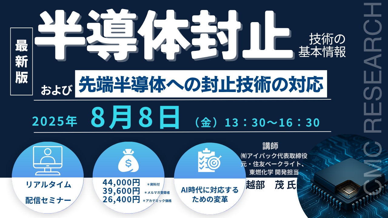 先端技術情報や市場情報を提供している(株)シーエムシー・リサーチ(千代田区神田錦町: https://cmcre.com/ )では、 各種材料・化学品などの市場動向・技術動向のセミナーや書籍発行を行っておりますが、 このたび「半導体封止技術の基本情報および先端半導体への封止技術の対応」と題するセミナーを、 講師に越部 茂 氏((有)アイパック 代表取締役)をお迎えし、2025年8月8日(金)13:30より、 ZOOMを利用したライブ配信で開催いたします。 受講料は、 一般:44,000円(税込)、 弊社メルマガ会員:39,600円(税込)、 アカデミック価格は26,400円(税込)となっております(資料付)。