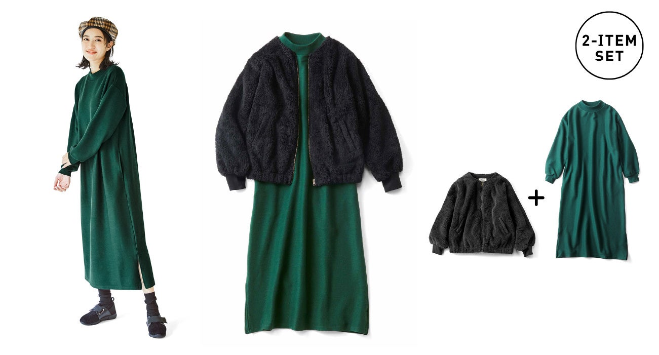 冬のコーデを彩る、ボアブルゾンとワンピースのコーデセットです。ボアブルゾンは、内側がフリース仕立てで軽やかながら、暖かく着ることができます。ワンピースはトレンドカラーのグリーンに、ハイネックで顔まわりをすっきり見せることができます。セットはもちろん、単体でも着まわしができるセットです。
