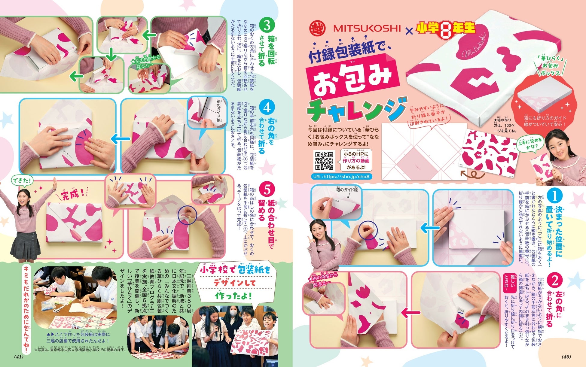 『小学8年生』では最もきれいに包めるサイズの専用箱と裏側にガイド線の入った包装紙を付録とし、百貨店での贈り物の包み方にはじめてでもチャレンジしやすく工夫しました。