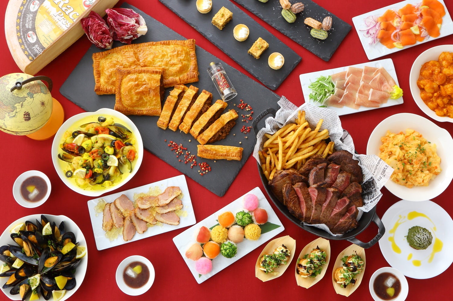 世界の一大祭典が開催される2025年。当ホテルでは、多様な文化が交差する食の祭典「ワールドブッフェ」を開催いたします。日本・中国・韓国・タイなどのアジア諸国をはじめ、アメリカ、フランス、イタリア、ベルギー、オーストラリアなど、世界19ヵ国(ランチは17ヵ国)が集う世界のグルメ紀行。パエリアやエビチリ、ブイヤベースなど聞き馴染みのある各国を代表するメニューから、オランダのヒュッツポット(マッシュドポテト)やトルコのバクラヴァ(重ねた薄いパイ生地に、ナッツをたっぷり挟んで焼き上げたスイーツ)など初めて聞くような伝統料理まで、わくわくが詰まった多彩なメニューをご用意いたします。また、シェフが目の前で調理するパフォーマンスコーナーでは、ランチはそば粉のガレット(フランス)、ディナーはステーキ&ポテト(アメリカ)とラクレットチーズ(スイス)を提供し、思わずリピートしたくなるメニューをお楽しみいただけます。