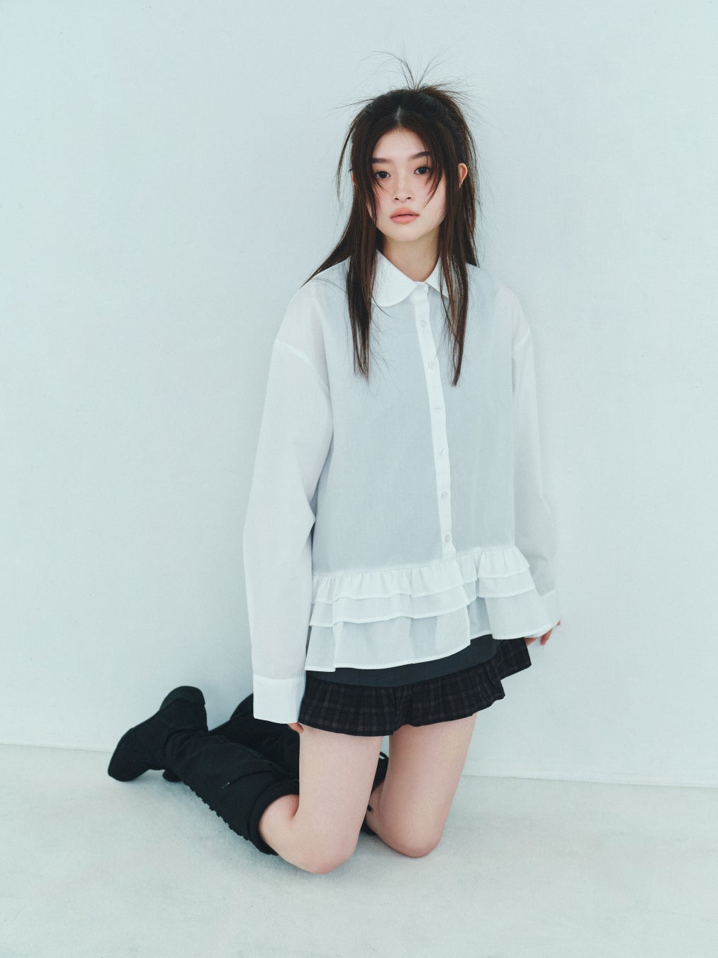 1【HEATHER HOLiC】フリルチュニックシャツ/¥7,190/サイズ フリー/アイボリー,ブラック