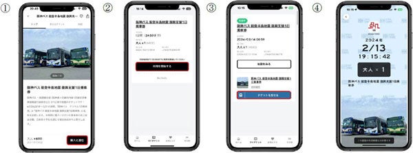 (1)「おでかけチケット」メニューで「阪神バス」を検索し、復興支援1日乗車券を購入する。
