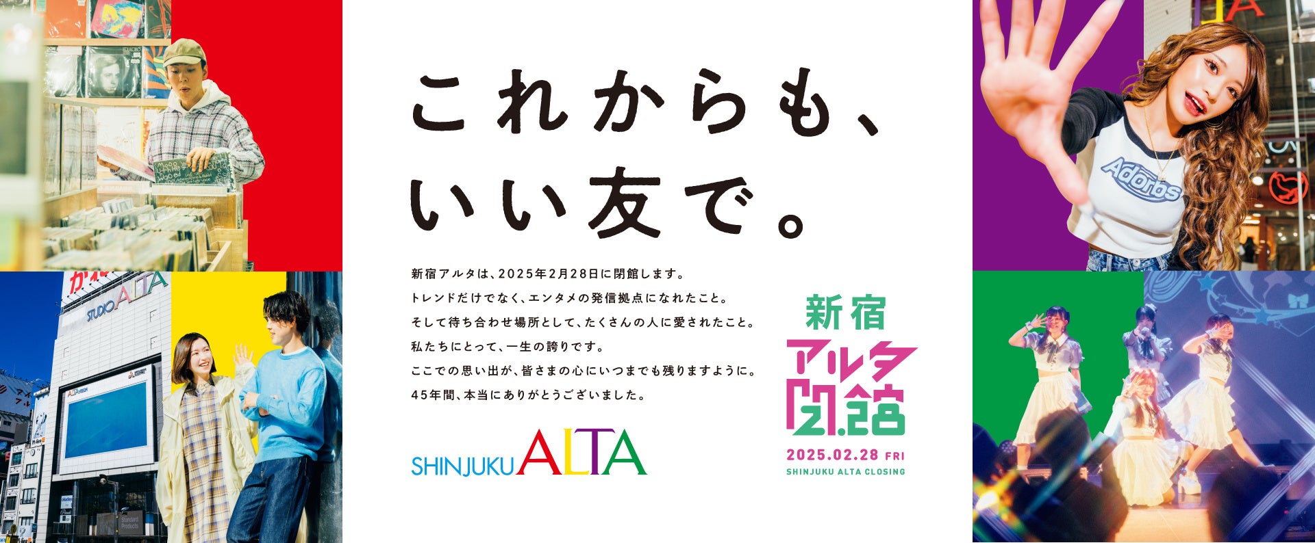 1980年4月に新宿にオープンし、これまで多くのお客さまにご愛顧いただきました「新宿アルタ」は、2025年2月28日(金)に閉館を迎える運びとなりました。ご愛顧いただきました皆さまへの45年間の感謝を込めて、「新宿アルタ・閉店イベント」を昨年2024年11月よりスタートしており、2月末日の閉館に向けて、新宿アルタらしさを大切にし、明るく楽しいイベントを開催し、営業最終日まで皆さまと共に館内を盛り上げてまいります。ぜひ、思い出を作りに新宿アルタにご来店くださいませ。