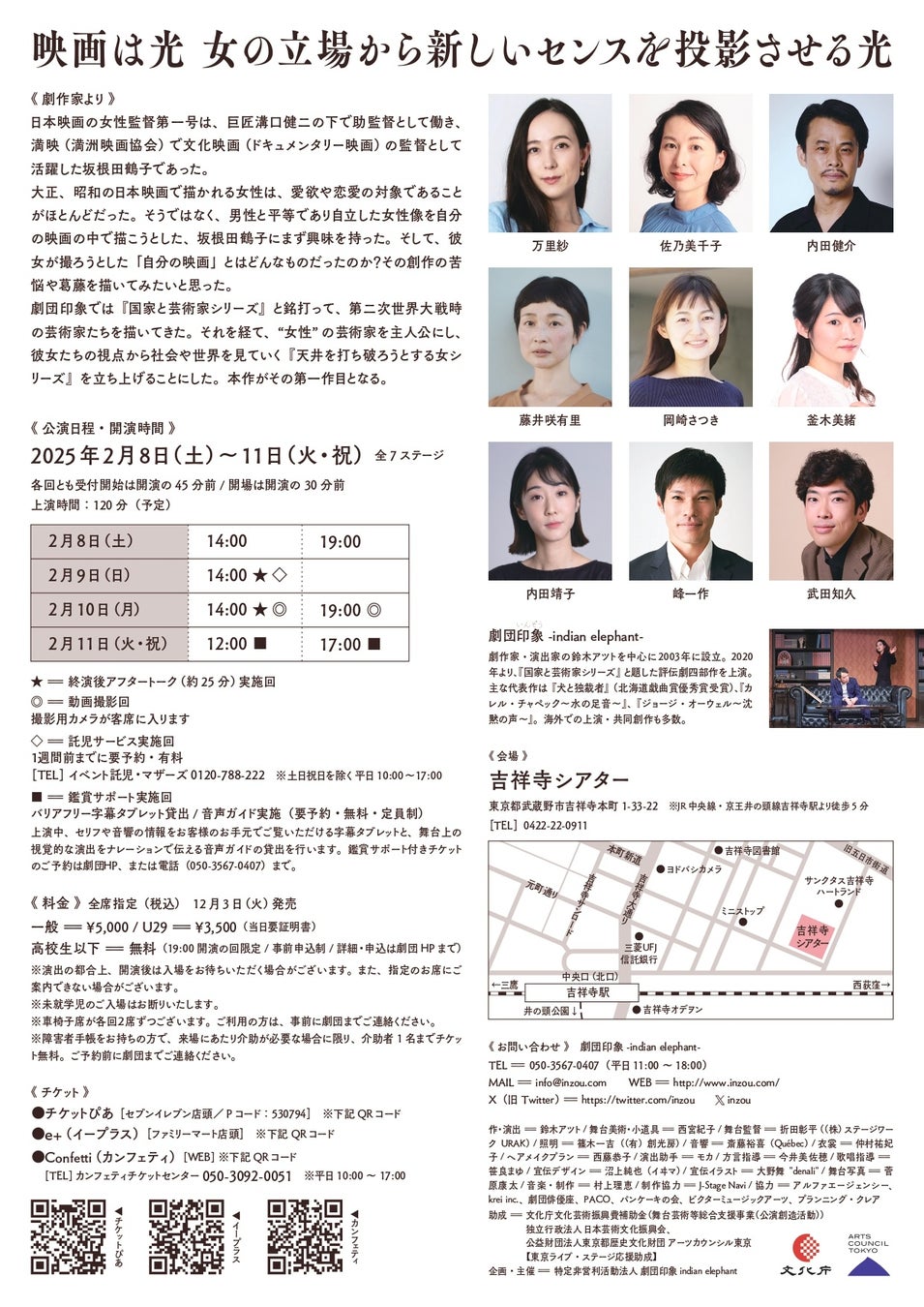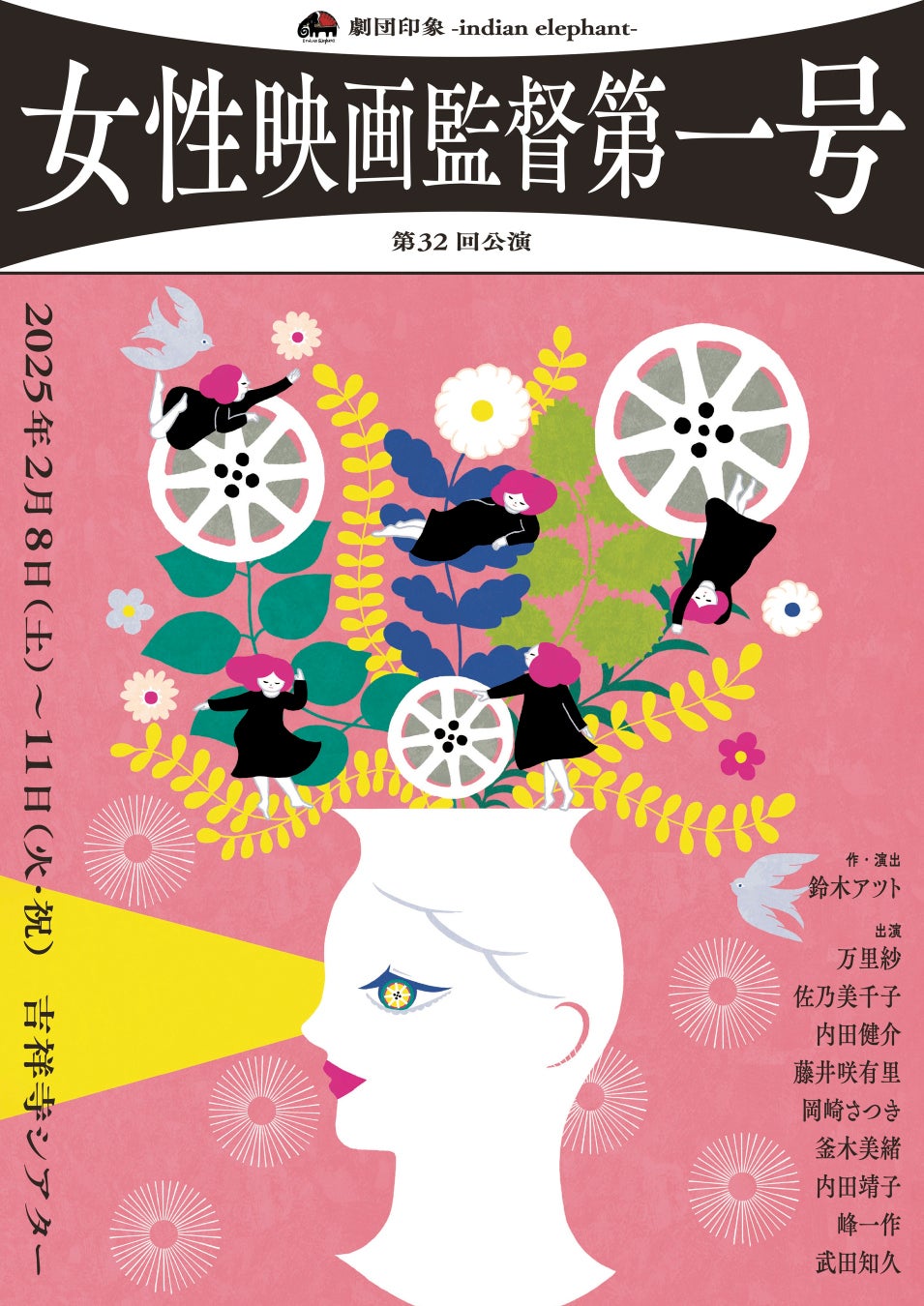 この度、劇団印象-indian elephant-は、2025年2月8日(土)~11日(火・祝)に吉祥寺シアターにて、第32回公演『女性映画監督第一号』を上演いたします。本作は、日本映画の女性監督第一号であり、巨匠:溝口健二の下で劇映画の監督としてデビューした坂根田鶴子の物語です。彼女は、日本国内では一本しか映画を撮れず、満映(満洲映画協会)に移り、文化映画(ドキュメンタリー映画)の監督として活躍しました。その彼女の苦難の半生を描きます。