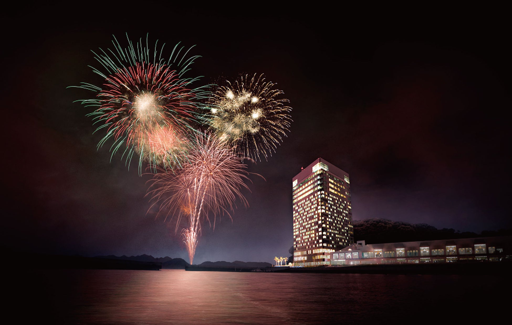 打ち上げ場所は、ホテル目の前の海上。海側の客室や上層階のレストランからは、花火が開く様子を目の前でご覧いただけます。鑑賞スポットの一つであるホテル1階のガーデンスペースでも、涼しい夜風に吹かれながら夜空を見上げるこの時期ならではのひとときをお過ごしいただけます。