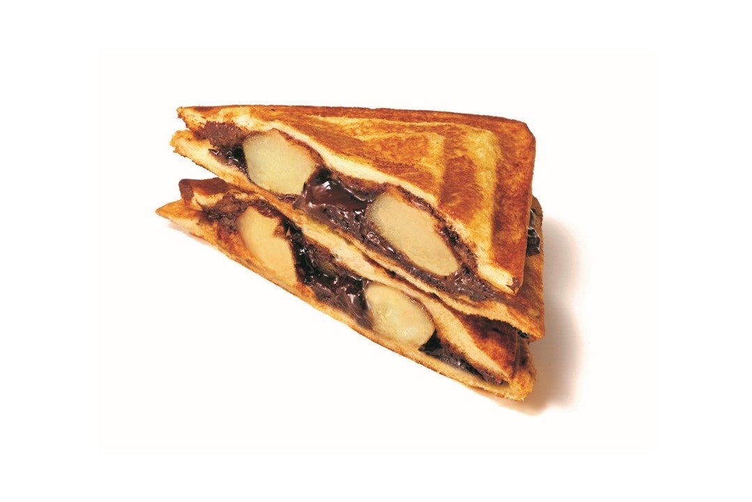 ビーントゥバーチョコレートの<ボナ>と食パン専門店<セントル ザ・ベーカリー>のコラボホットサンド!ビターチョコレートたっぷり使い塩キャラメルペーストと洋梨のコンポートをサンドしました。