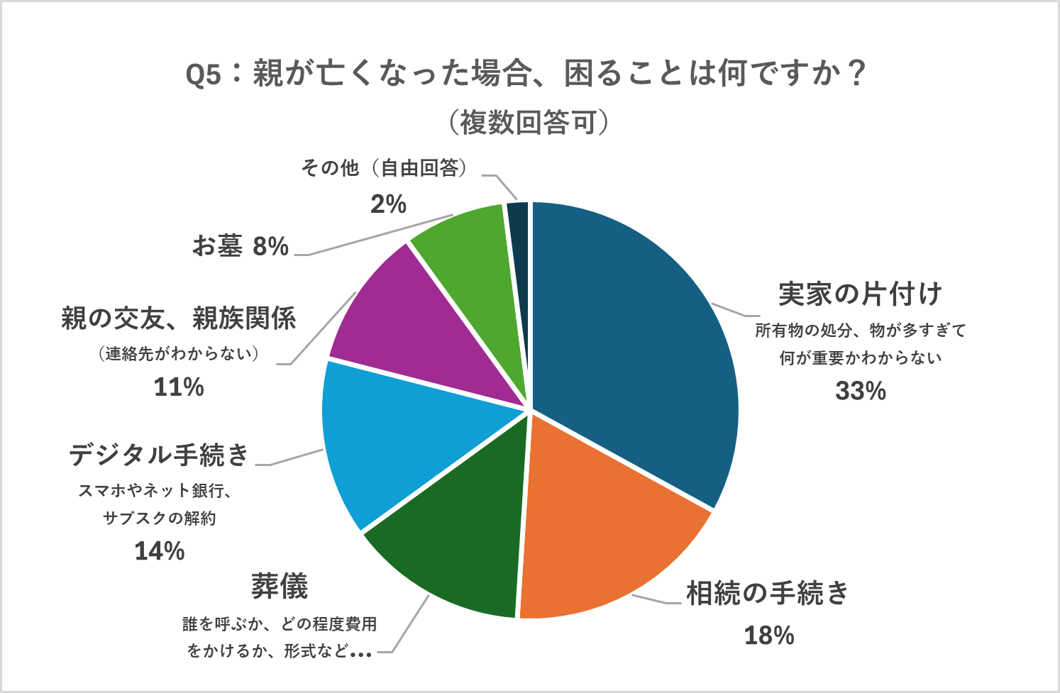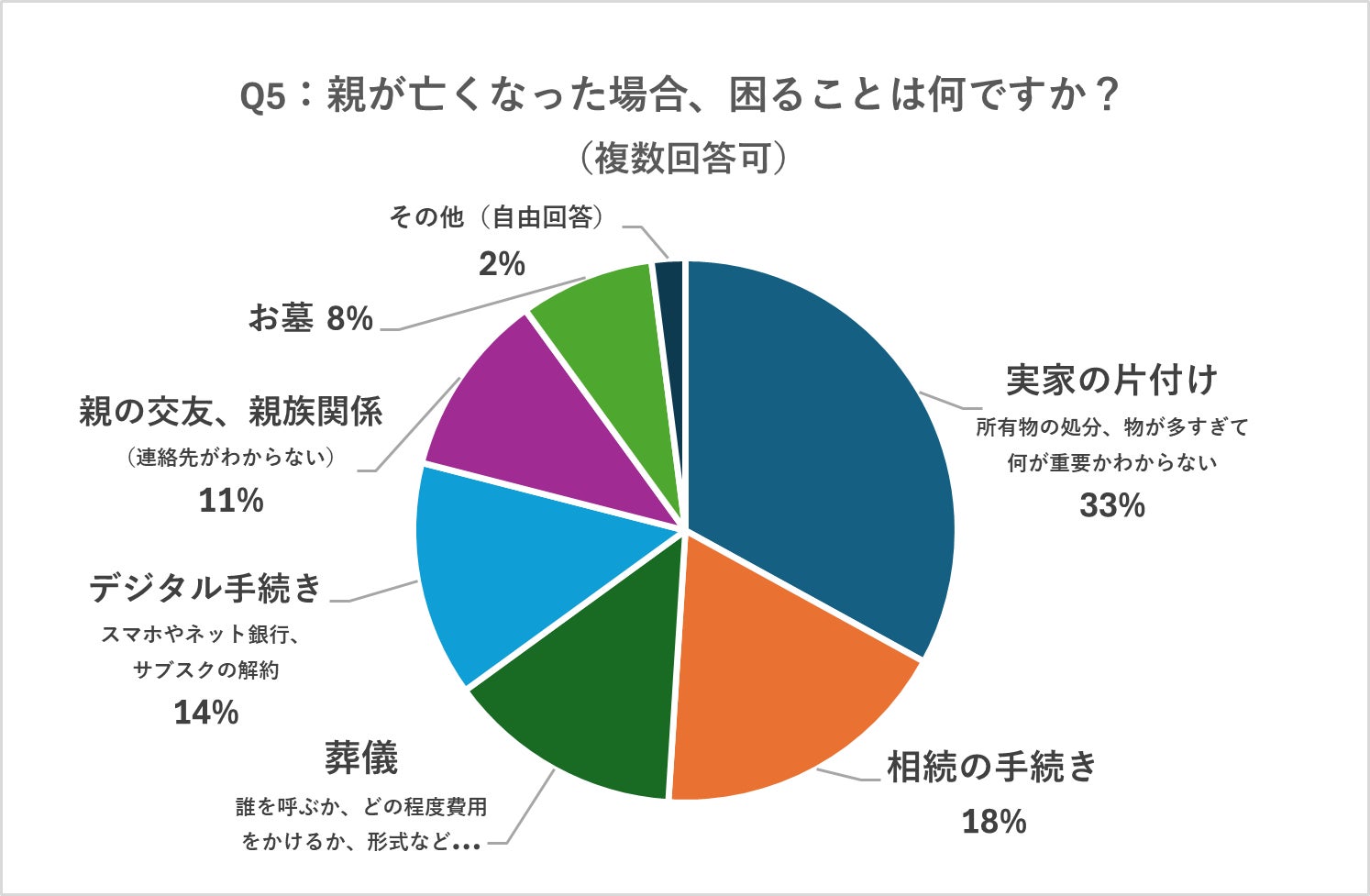 1位が「実家の片付け」(33%)、次いで「相続の手続き」(18%)「葬儀」(14%)「デジタル手続き」(14%)で困る人が多く、子ども世代の切実な不安が顕在化した。