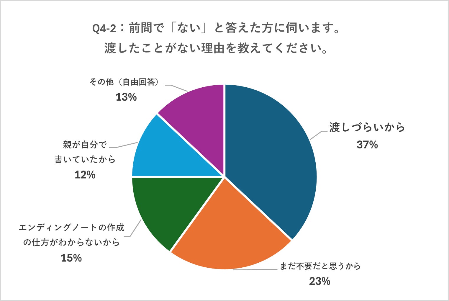 「渡しづらいから」が約4割と最も多く、次いで「まだ不要だと思うと思うから」(23%)「エンディングノートの作成の仕方がわからないから」(15%)という結果に。自由回答からは、「どこで手に入れられるか分からない」「いつから準備してあげるべきかわからない」という意見も。