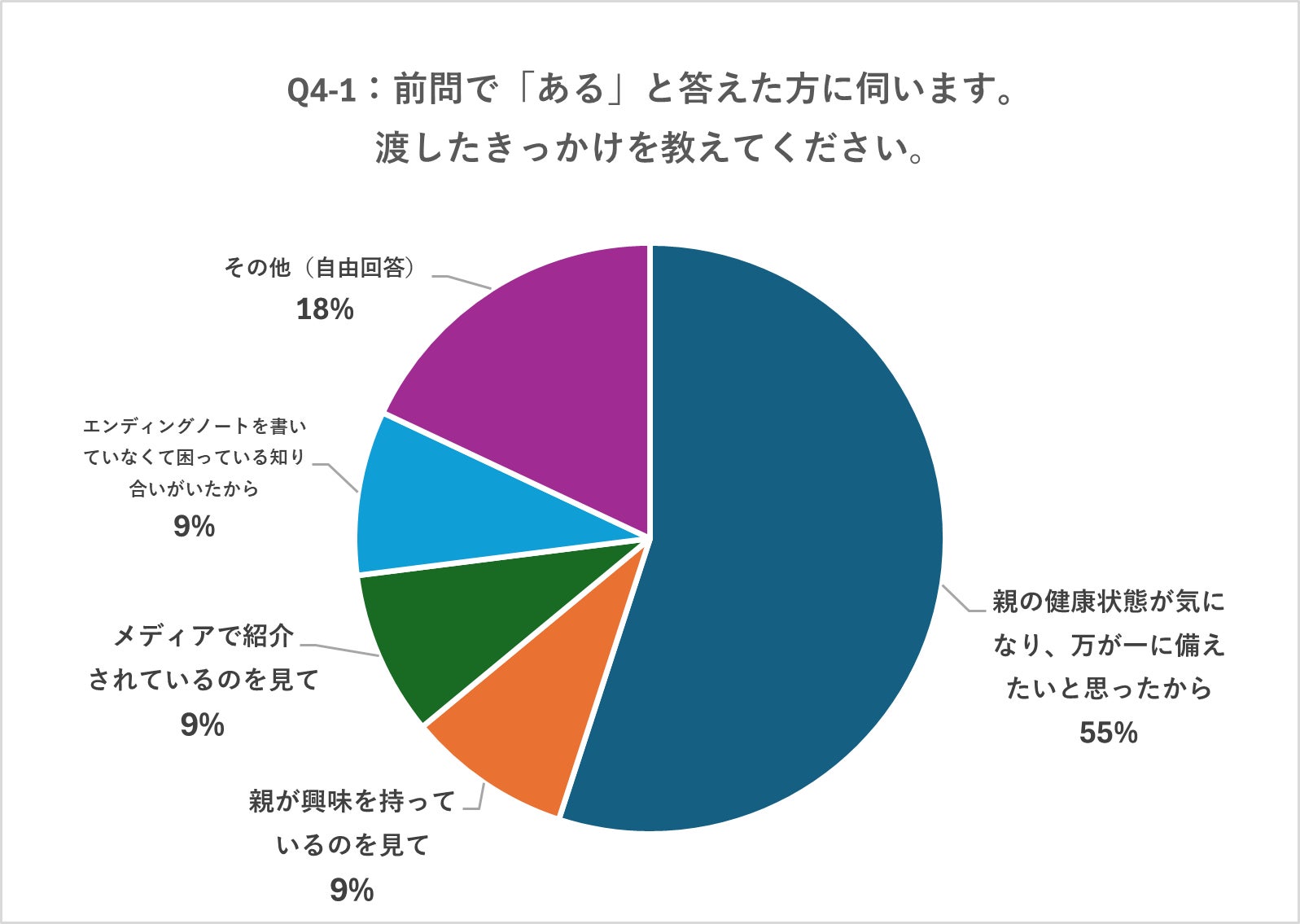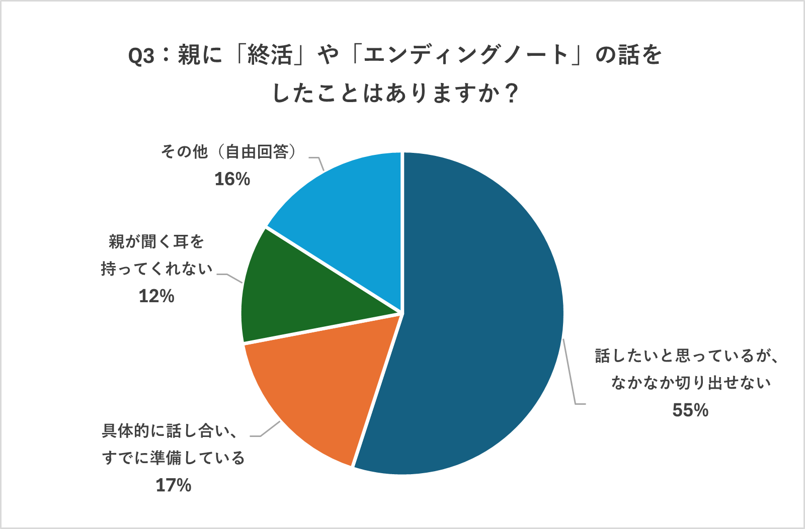 「具体的に話し合い、すでに準備している」は17%に留まり、55%が「話したいと思っているが、なかなか切り出せない」と回答。自由回答からは、「親が自らやっているので、話す必要がなかった」という意見も。
