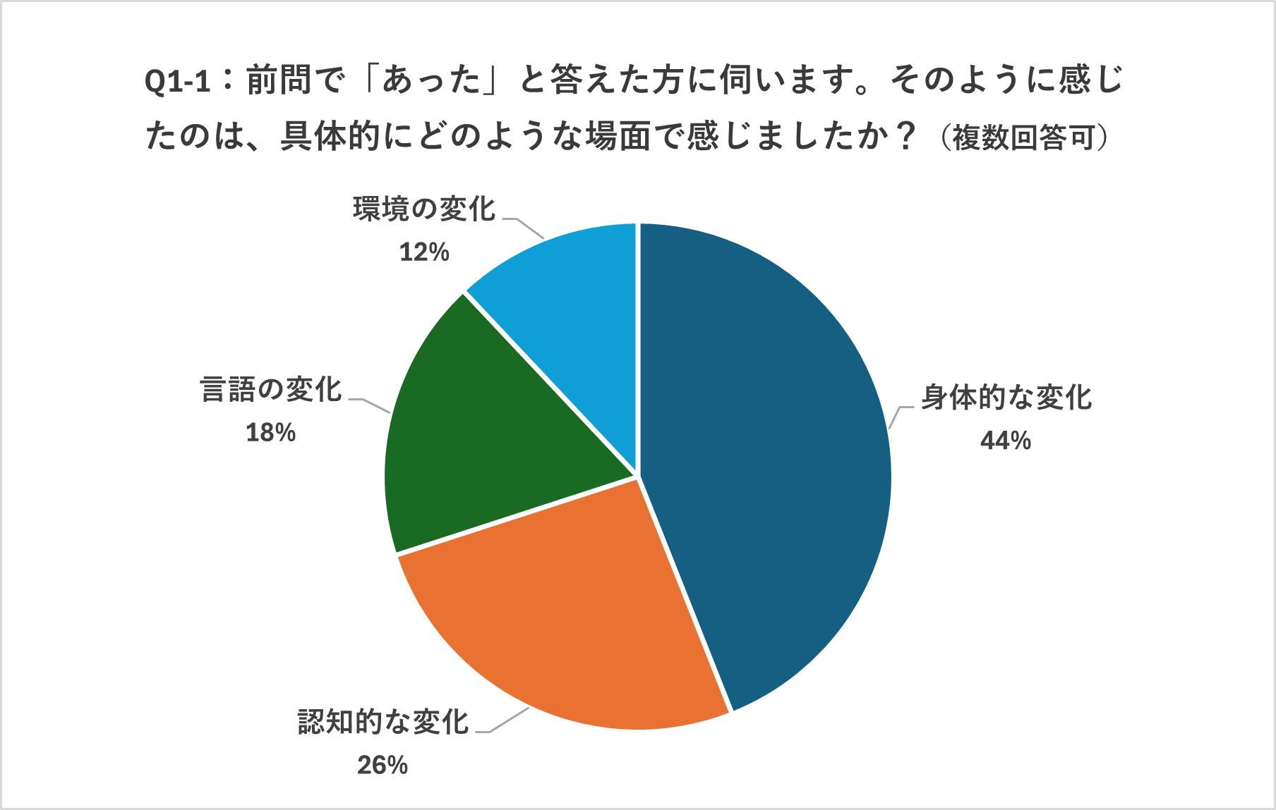 「身体的な変化」(44%)、次いで「認知的な変化」(26%)という結果に。目に見える衰えだけでなく、コミュニケーションの違和感からの不安も。