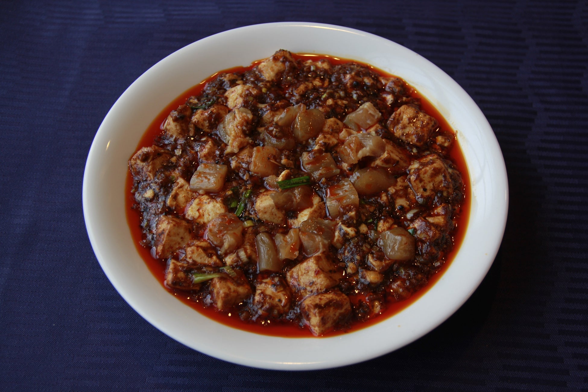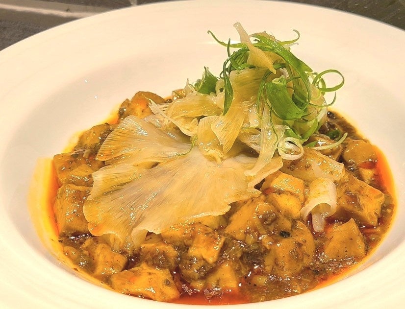 <古樹軒>は大阪心斎橋にある『フカヒレを身近に、さらにおいしく』をコンセプトに日本トップシェアのフカヒレ屋が営む中華料理店。自社で鮫魚体を市場で仕入れるところから製造、販売まで一気通貫で行っており、心斎橋店ではフカヒレのどんぶりや麺料理が一押しです。そんな<古樹軒 心斎橋店>からは、1皿で鮫全体を味わってもらえる「極みフカ麻婆」が登場。麻婆豆腐の味付けは通常品と同じですが、豆腐だけではなく、料理の1/3に鮫肉を使用しているため、鮫と豆腐の全く違う食感と味が両方楽しめます。またフカヒレの希少なコラーゲン部位『魚唇(ユイチェン)』も入れることで味に深みが増しています。仕上げにフカヒレと葱を和えたものを盛り付けて、更にフカヒレの姿もトッピングした贅沢な一品です。